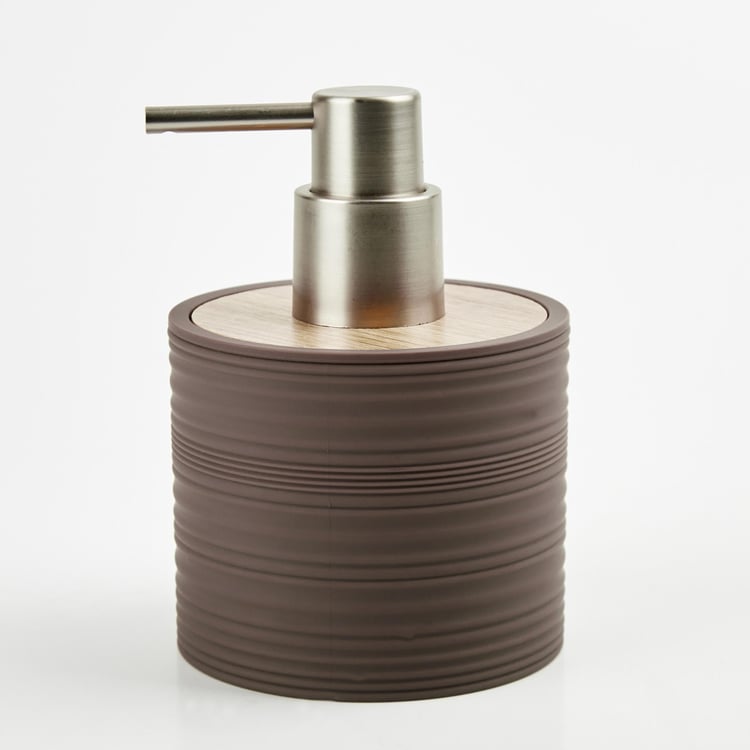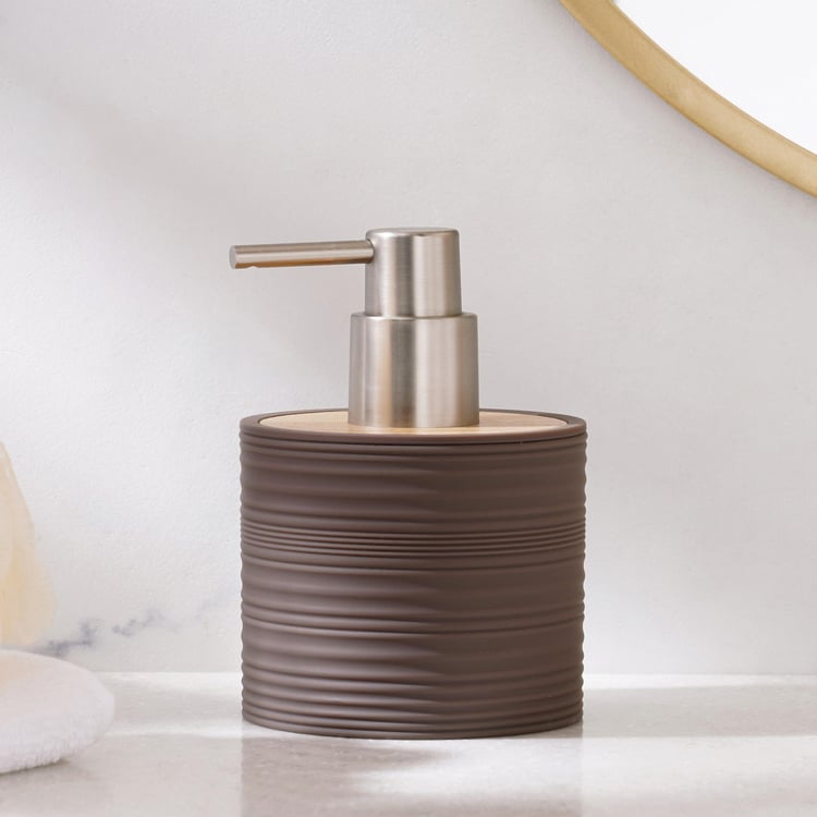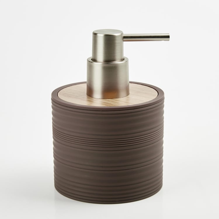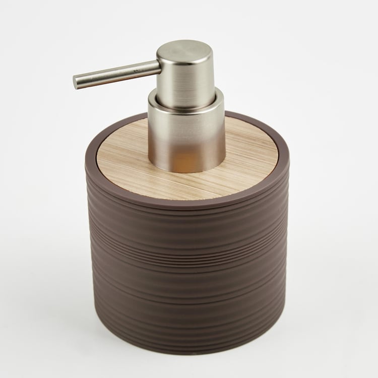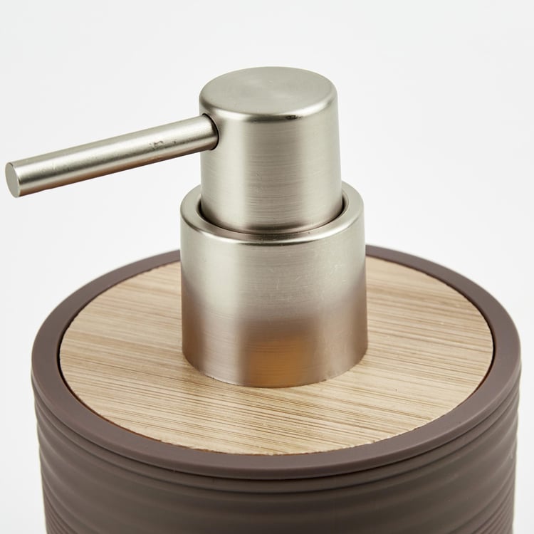 Durable and minimal, this soap dispenser can fit into most bathroom decors. It is made of ABS and rubber in a cylindrical profile with ribbed detailing for added style. The top is updated with bamboo and includes a dispensing lid. It is ideal for storing lotion, shower gel, and more. Combine with other accessories from this collection to redefine your vanity counter.