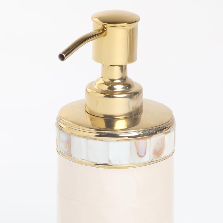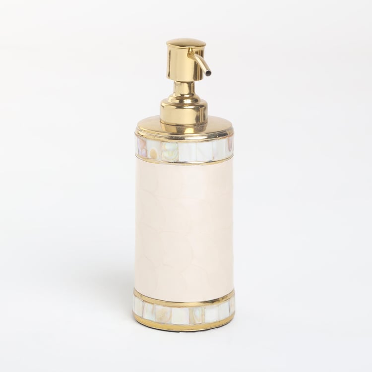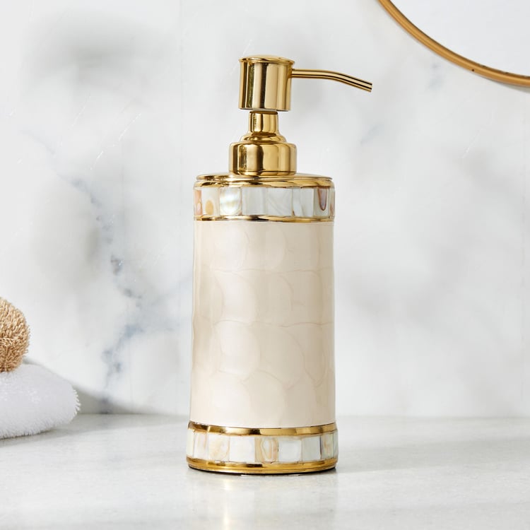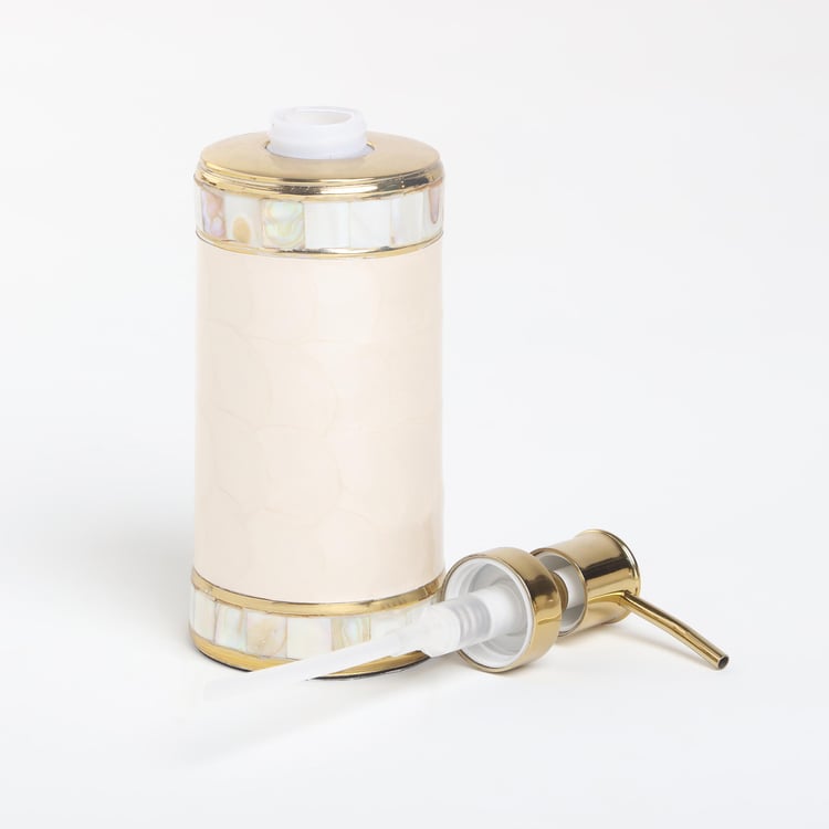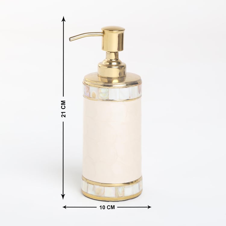 Add a decorative and functional addition to your bathroom space with this soap dispenser. It is made with a textured floral surface. This cylindrical-shaped profile comes with a metal dispensing top. It is ideal for storing liquid soaps, lotions, or shower gels.