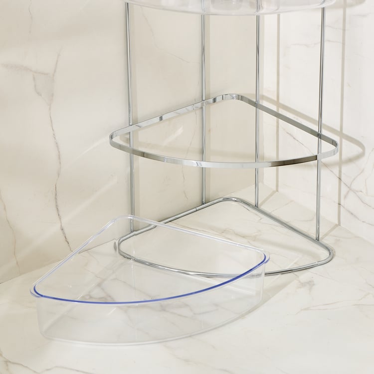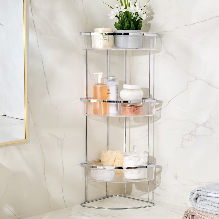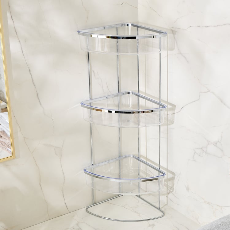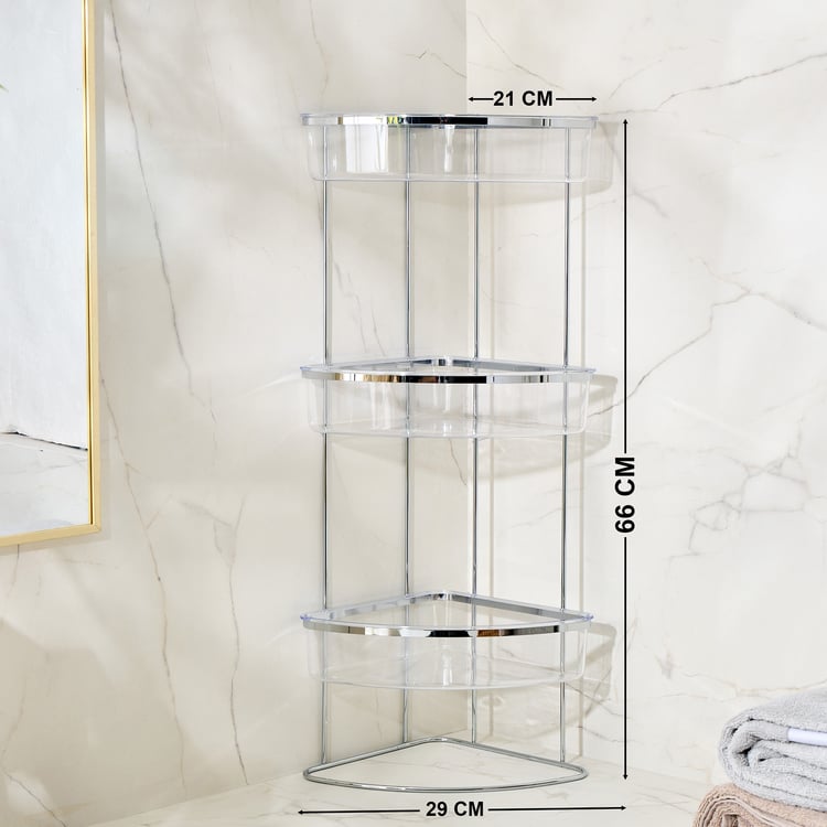 This 3-tier corner caddy features a sturdy iron frame with durable plastic shelves. It offers space-saving storage, easy maintenance, and organised convenience for bathrooms.