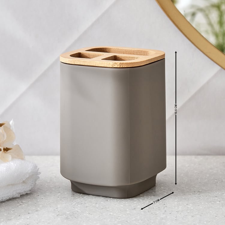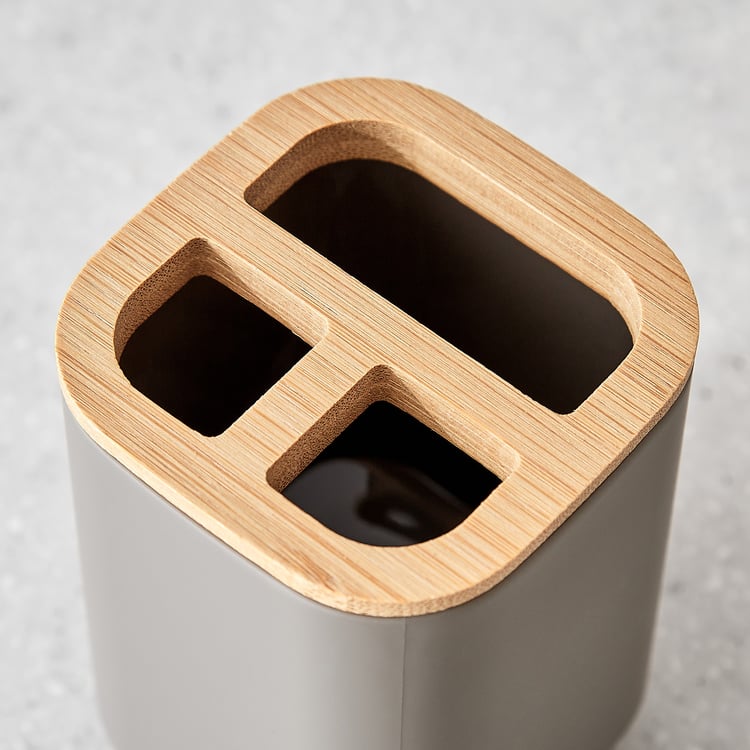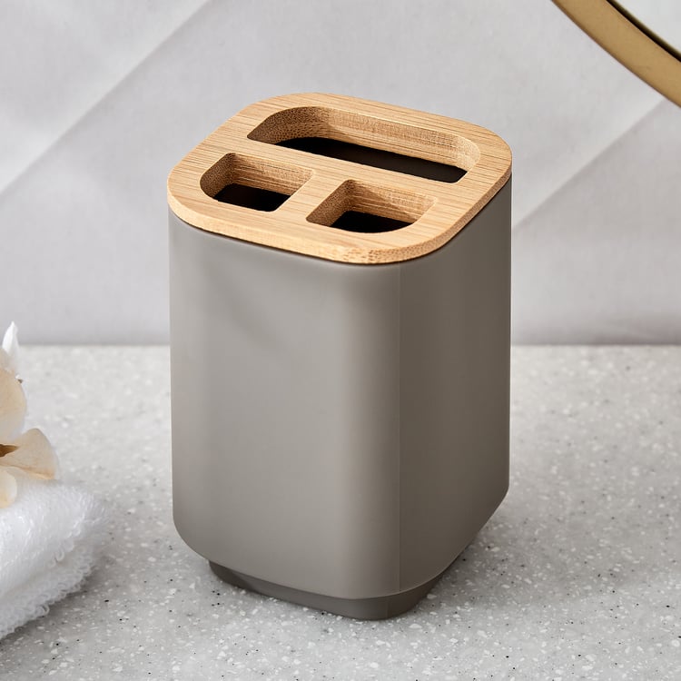 Keep your vanity counter organised with this toothbrush holder. It combines ABS with a rubber-coated finish and a bamboo top for a balanced blend of durability and natural texture. Its three-section layout keeps toothbrushes and dental items organised and separated.