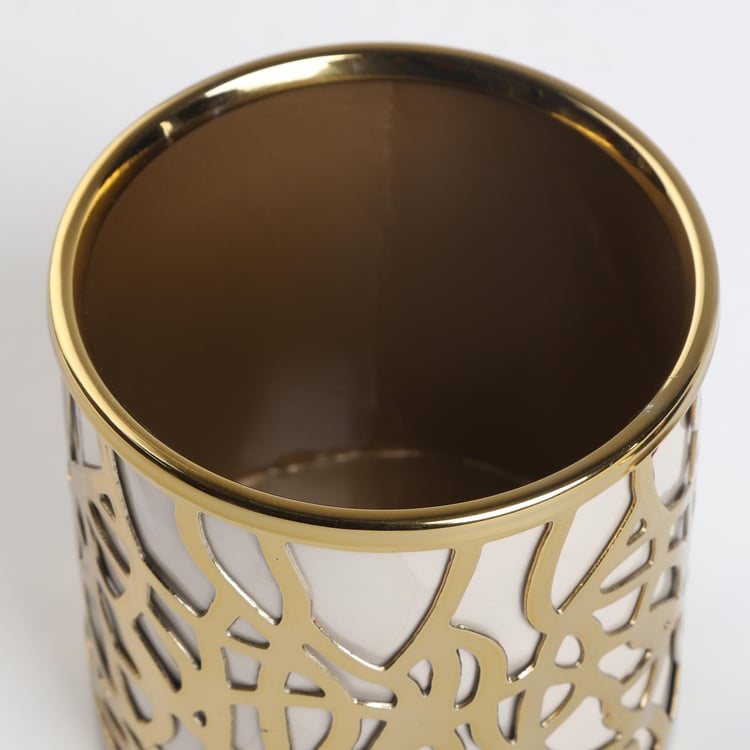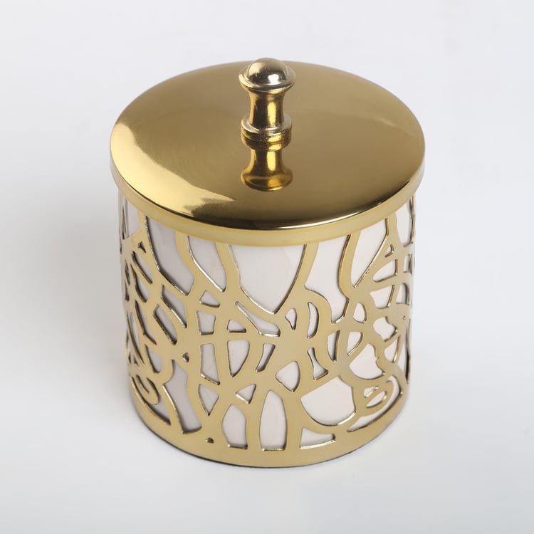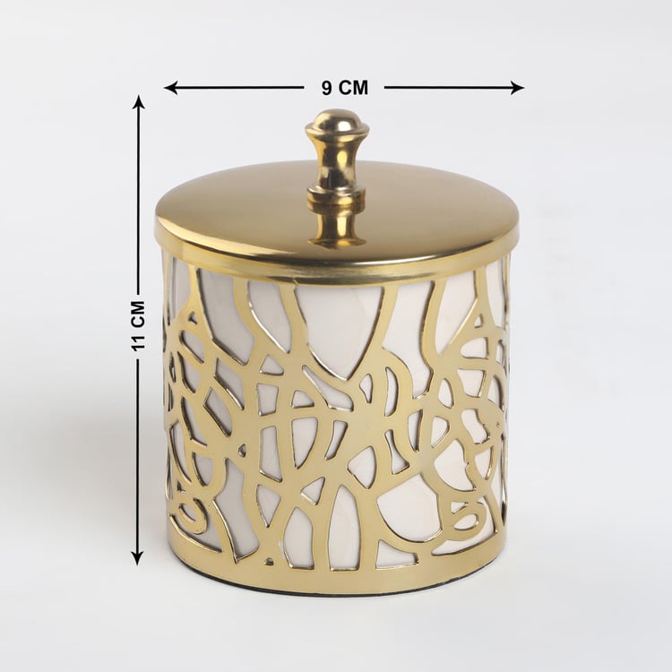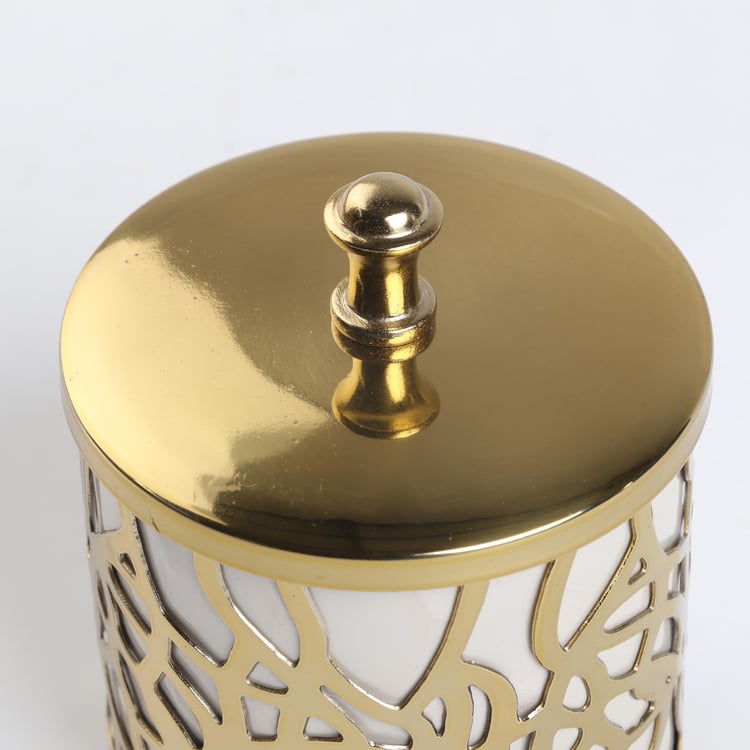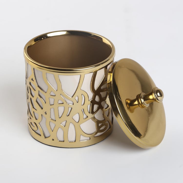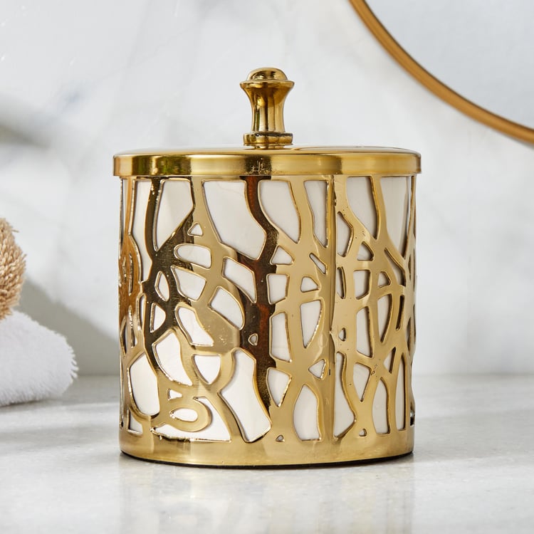 Bring opulence into your bathroom space with this cotton canister. It is made of metal with abstract cut-outs for a striking look. This canister comes with a lid on top to prevent dust and moisture from entering. This canister is ideal for storing cotton balls, extra toilet paper, and other bath accessories.