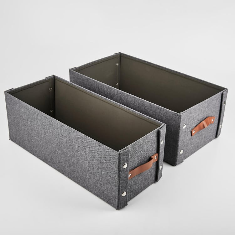 Keep your space organised with this set of storage bins. It is made of cardboard and paper with a fabric covering. The PVC handles add to the convenience. These bins are collapsible and can be folded when not in use to save space.