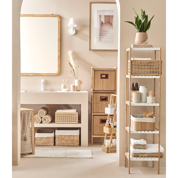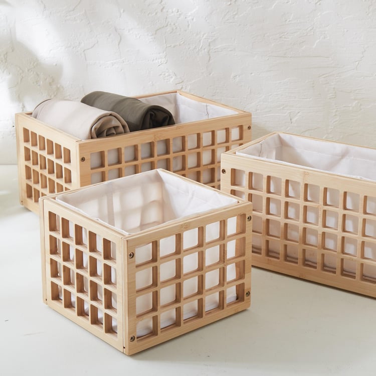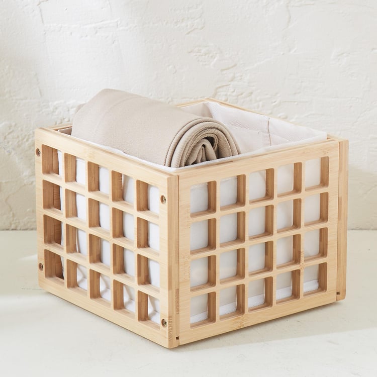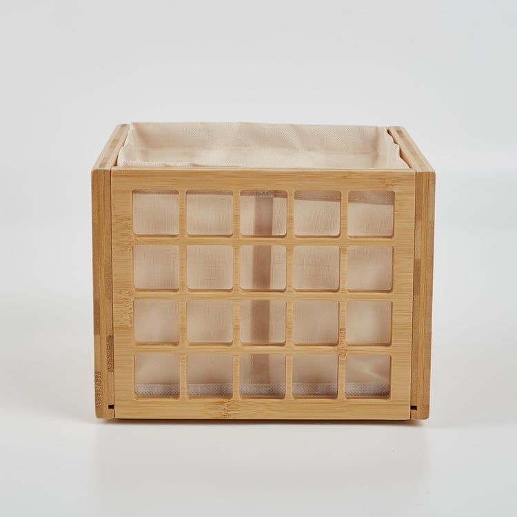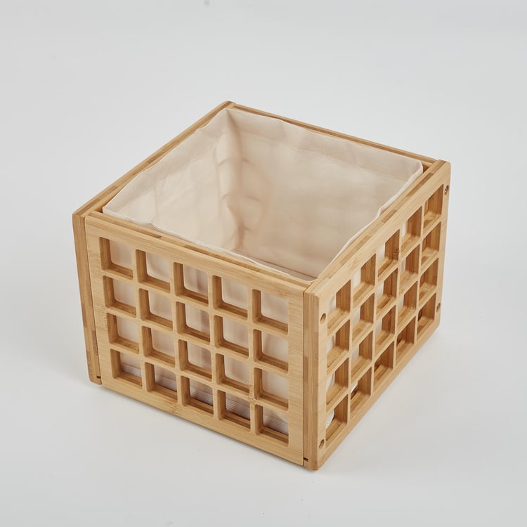 Keep your space clutter-free with this storage basket. Made of bamboo and MDF, it features a cubical profile with window cut-outs. The cloth lining makes it easy to store a multitude of items.
