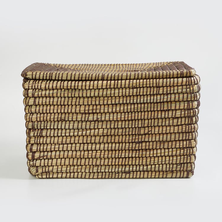 Made from sturdy seagrass and plastic, this storage basket is an easy one-place holder. Being a versatile storage solution, this basket is great for storing clothing, linens, bath and cosmetics products, toys, school supplies, magazines, and more. Built-in handles for easy transport. The rectangular shape fits more into deeper shelves. Suitable for your bedrooms, bathrooms, living room, closets, and shelves.