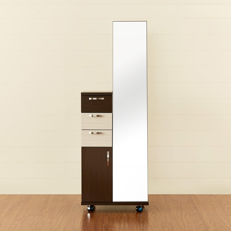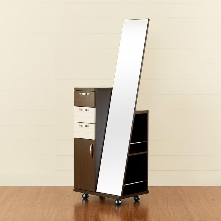 Carcass (Internals)/ Door/ Drawer Fronts: It is engineered wood with a smooth surface with no grain making it easier to work and paint. It is resistant to termite and wood borers. Finish type - 4 Side edge banding: All panels which are exposed to air, are edged with PVC banding on 4 sides to avoid contact with water, moisture, and insects. This helps to improve durability. Finish type - Melamine finish: Both sides are laminated on MDF/ Particleboard/ Plywood to make the furniture heat, scratch, and be stain-resistant. This helps to enhance looks and to increase durability. Treatment type - Formaldehyde resin for lower emission: All panels are pre-treated with industry-standard chemical composition thereby making the core resistant to termite, borer, and other mites. Certification - E2 boards: Engineered wood used is certified European Emission standard E2 grade, thereby it's certified safe for indoor furniture application. Additional hardware - PVC spacers, levellers: Furniture plinths/panels/legs are enabled with built-in PVC spacers to avoid direct contact with the floor, thereby ensuring no direct contact with water, dust etc., also levellers have been used on precision assembled furniture such as sliding wardrobes to take care of floor undulations. Door type - Hinged door wardrobes/other cabinetry: The total area required with space for doors to open is 300-350 mm allowing enough clearance for doors opening. Storage Type - Drawer storage: 3 storage drawers for multipurpose utility. Load-bearing capacity - Weight bearing of static/adjustable shelves: 5-7 Kgs. Functional hardware type - Telescopic runners for drawers: Ideal for wider semi heavy-duty drawers. Caters up to 12 Kgs dynamic weight carrying capacity. Mirror Type: Reflective full-length mirror as a part of the eternal door.