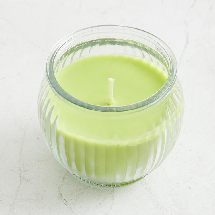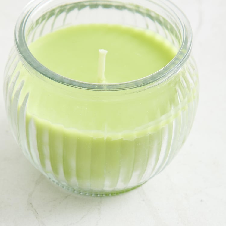 Lightening up the glow of your personal space with its ultra-modish design, this ribbed glass jar candle spreads a sweet fragrance and lasts longer than most scented candles.