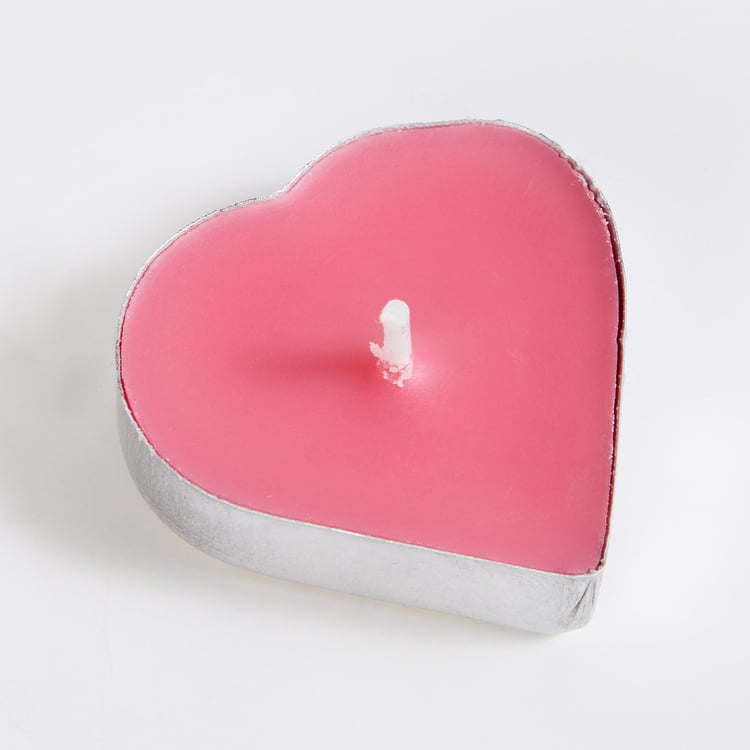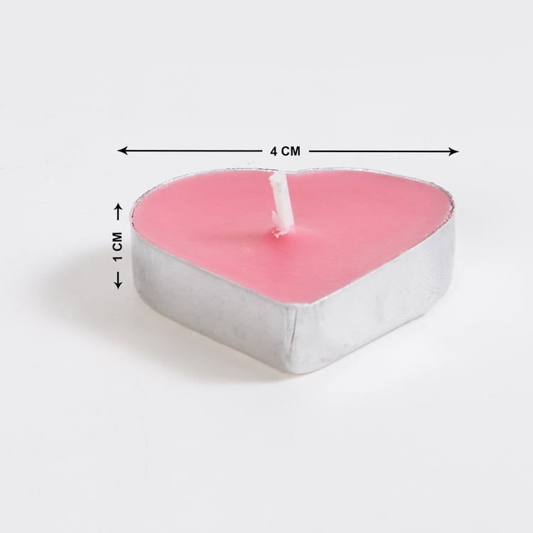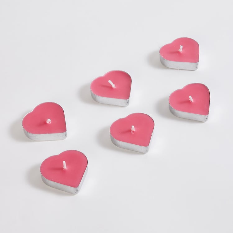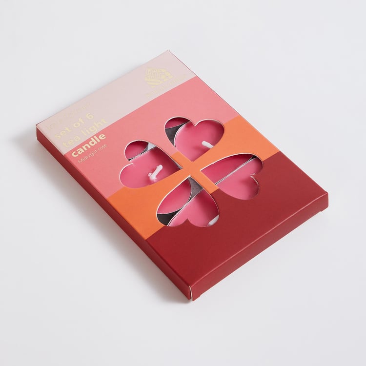 Create a romantic ambience with this set of T-light candles. It includes 6 heart-shaped candles with a single wick. The candles are made of paraffin wax and infused with midnight rose fragrance to brighten the space.