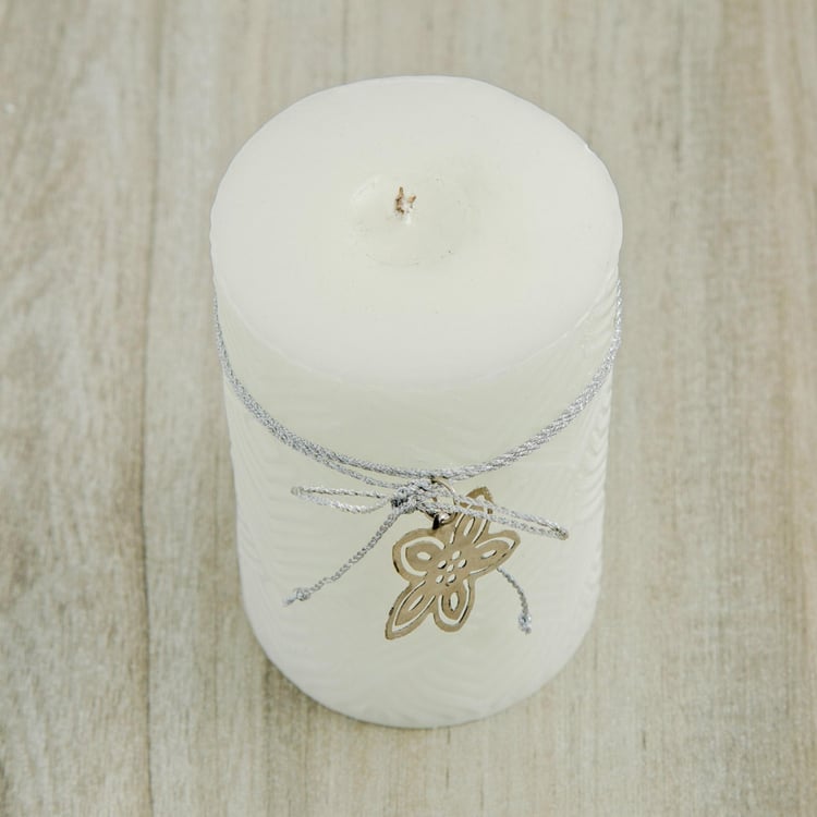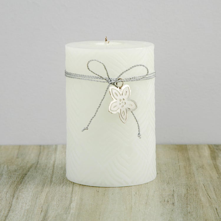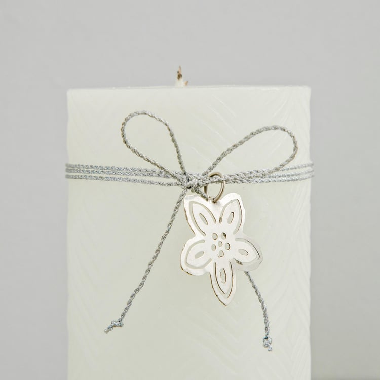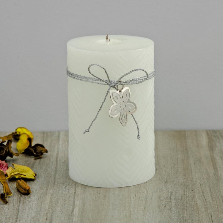 With an enticing metal accent and intricate embossing bringing a modish look into the scene, this pillar candle spreads a soothing fragrance to maintain a pleasant ambience.