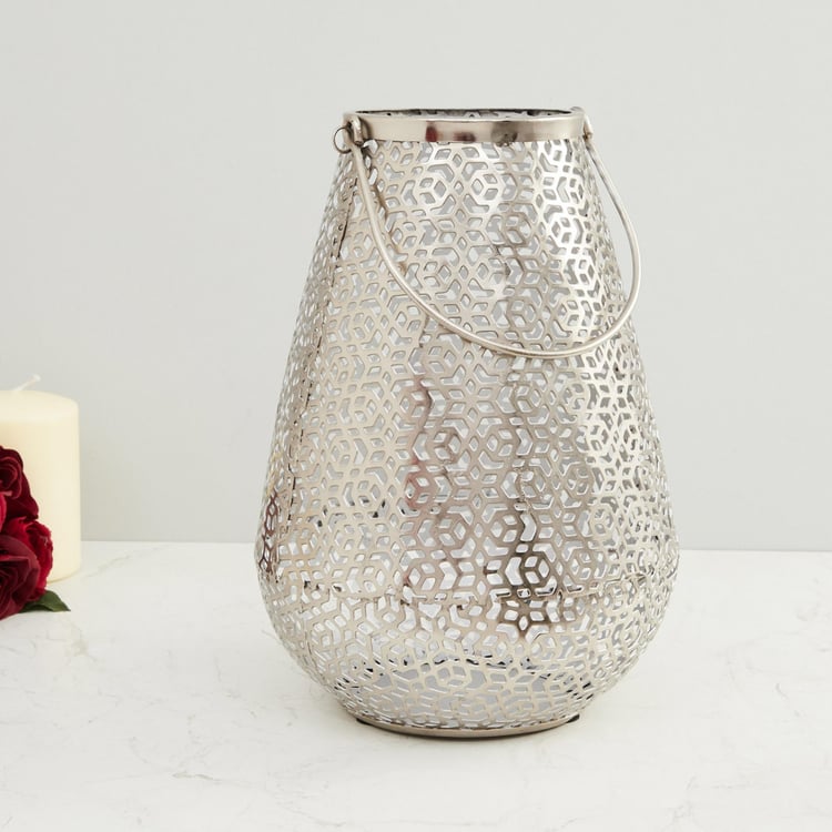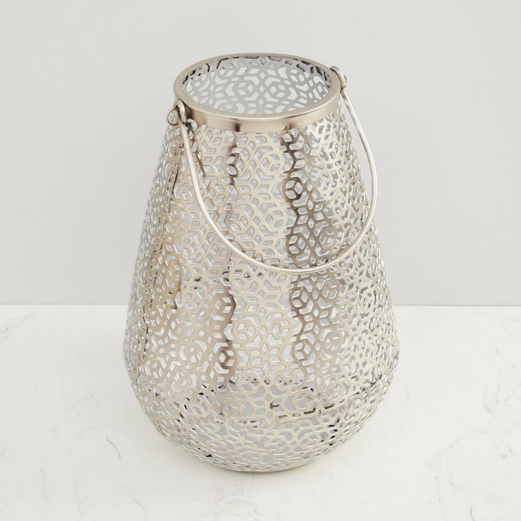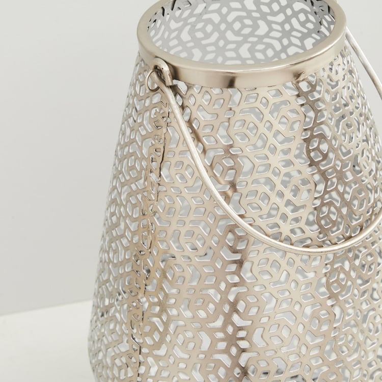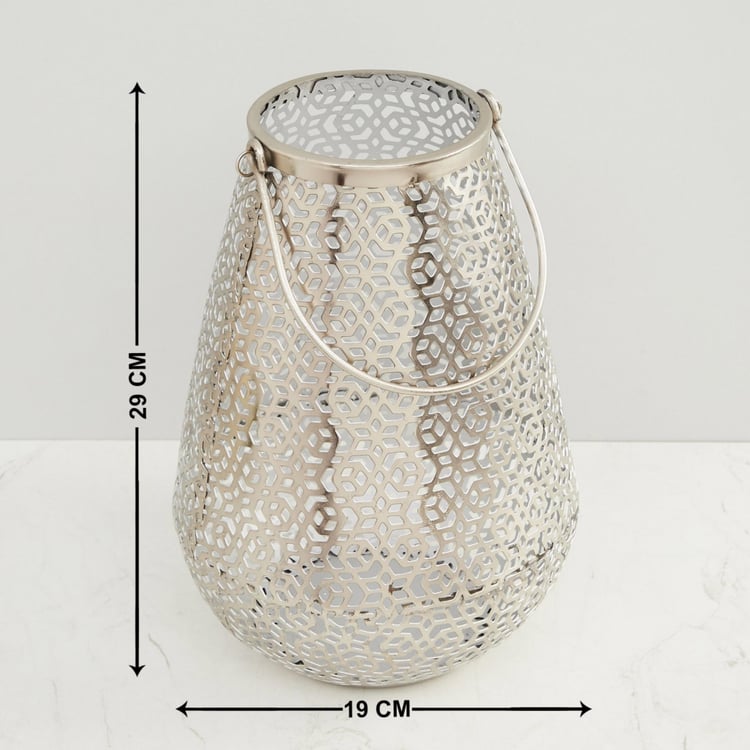 Crafted from metal, this round lantern is complemented with a lattice detail and a hook. Add this to your living room decor and lighten up your house with positive vibes.