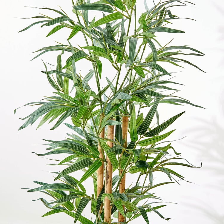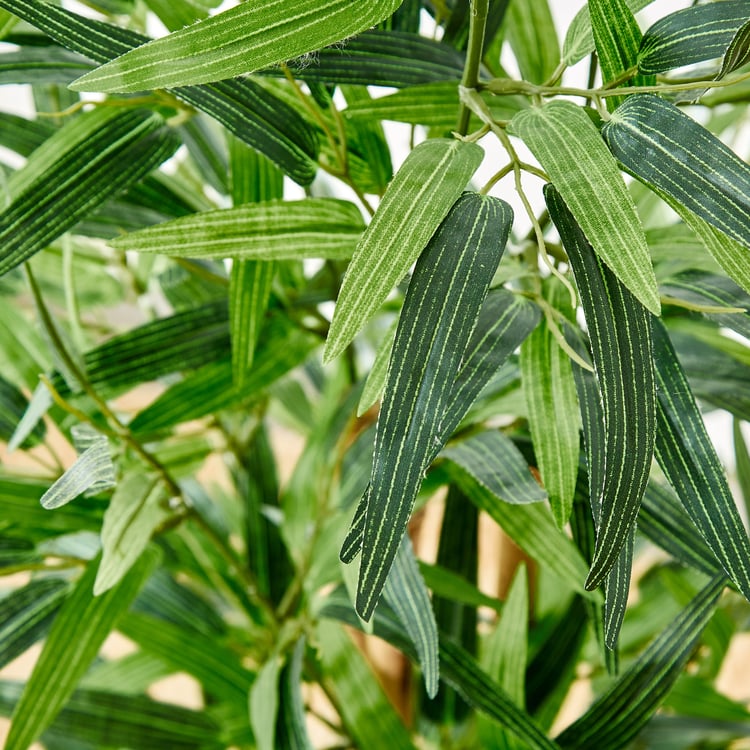 Embrace the serene beauty of this artificial bamboo tree. Made of eucalyptus wood, fabric, iron, and polyethene, it features realistic, lush green leaves. Housed in a sleek polypropylene pot, it complements both modern and traditional aesthetics, making it perfect for living rooms, offices, or tranquil meditation spaces.