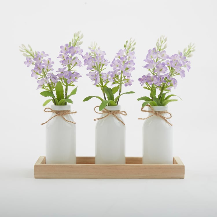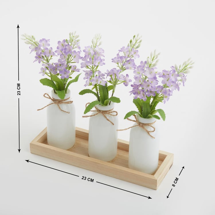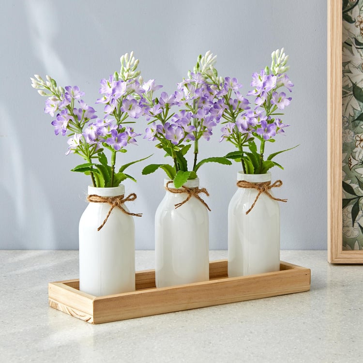 Give a finishing touch to your décor with this set of artificial flowers. The Alyssa flowers are made of plastic and polyester, hence do not require any maintenance. They come with 3 glass pots and a wooden tray.