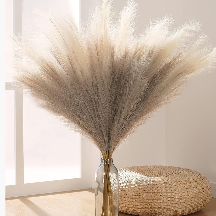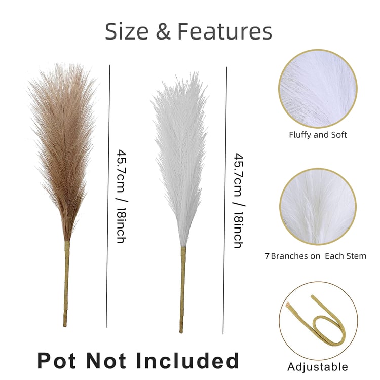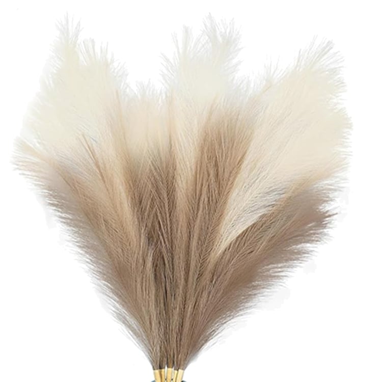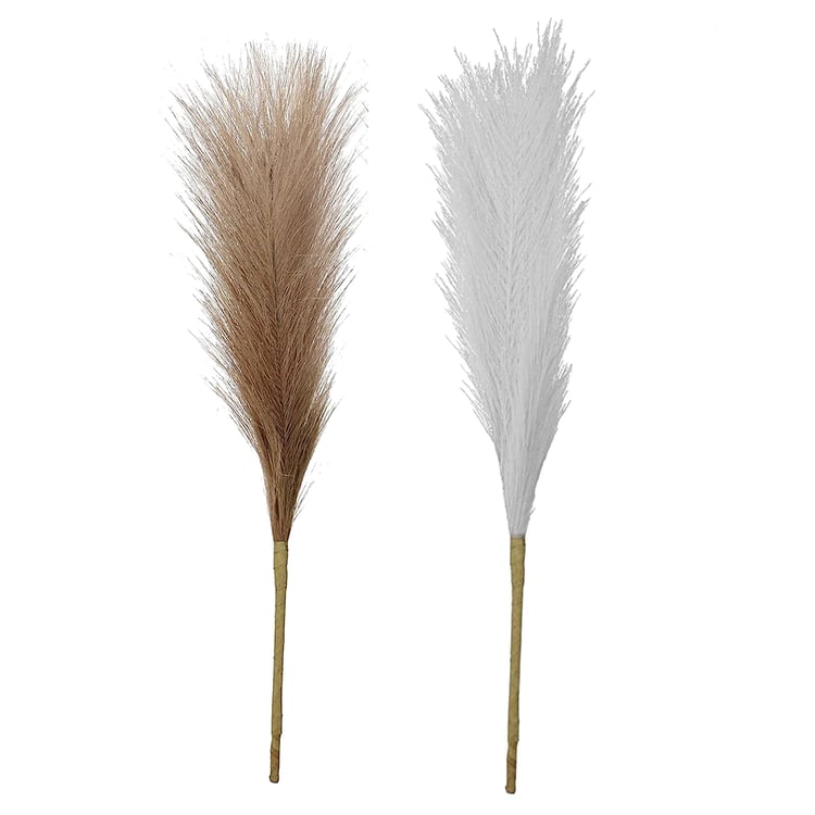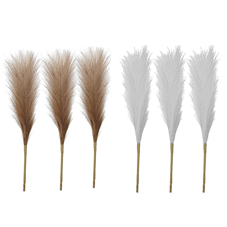 Add effortless elegance to your decor with this set of 6 artificial pampas grass sticks in two different tones. Designed to bring a soft, natural look without maintenance, it is crafted using a blend of iron wire, cloth, and plastic. These pampas stems feature a fluffy, full appearance with multiple branches on each stem for a realistic, airy effect. The flexible, adjustable stems make it easy to shape and style them to suit different vases and arrangements.