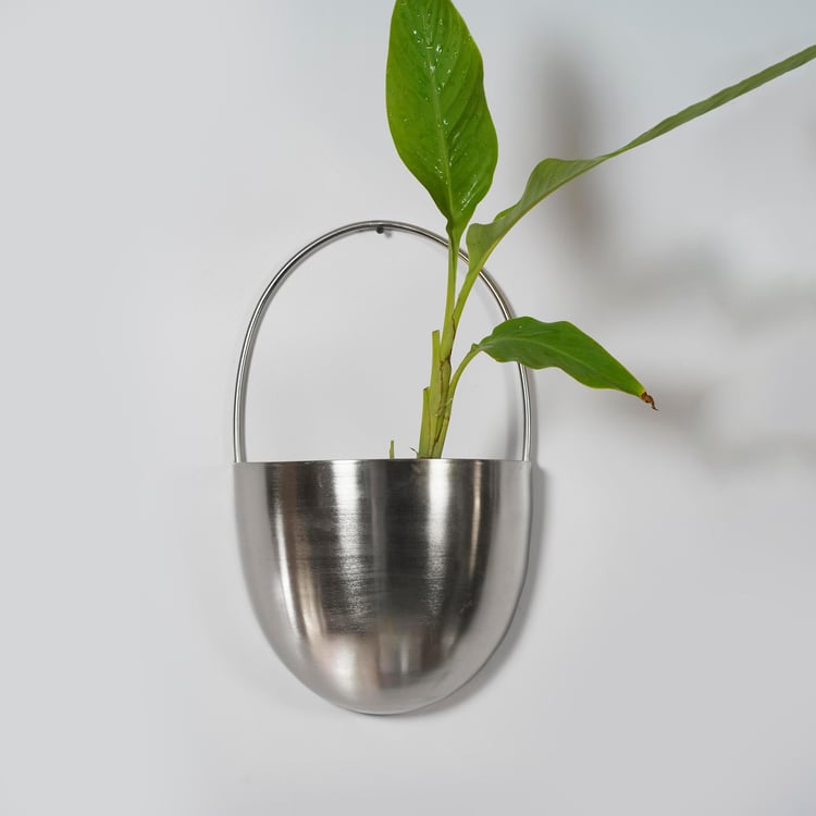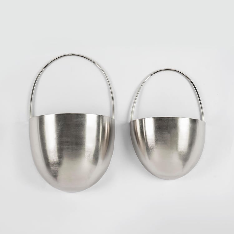 Decorate your indoor wall with this set of planters. Made of metal, this set includes a large and a small planter. This set features a curved design with a half-ring handle for easy hanging. Add artificial flowers or dry stems to amplify the decor.
