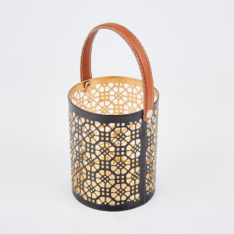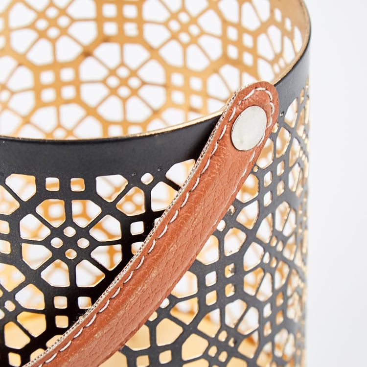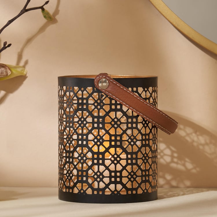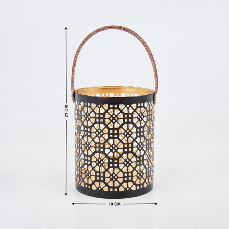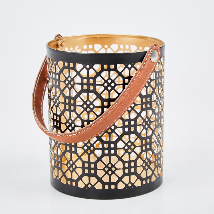 Decorate your bookshelf or end table with this hanging lantern. It has an iron base that is durable and features geometric stencil patterns for a unique look. The handle is made from faux leather for a luxe touch. Add a pillar candle to brighten a corner of your home.