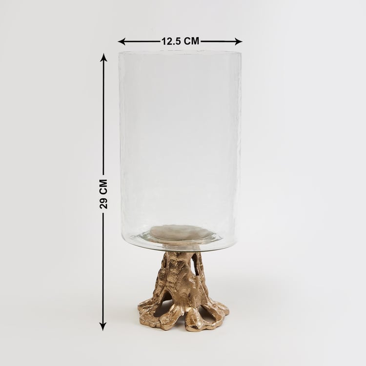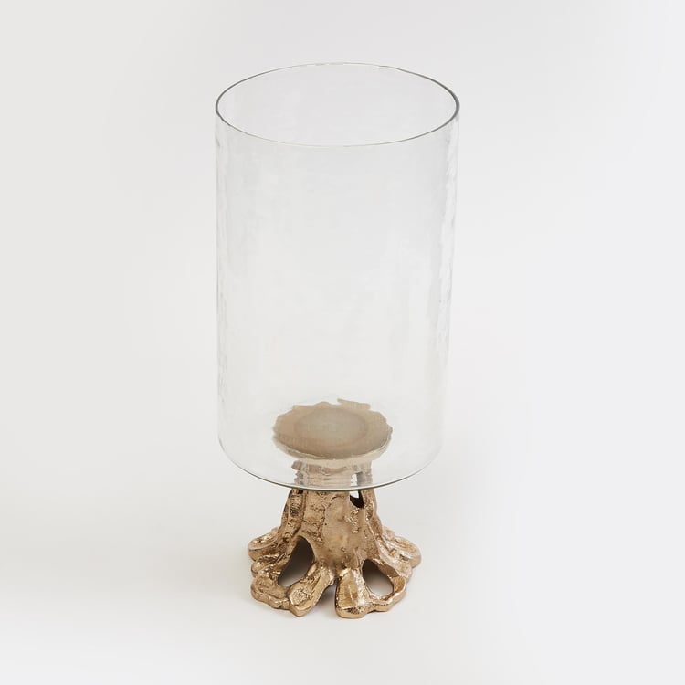 Add a luxe touch to your decor with this candle holder. It is handcrafted with an aluminium shell base that shows master craftsmanship. The cylindrical hurricane candle holder at the top is ideal for placing pillar candles.