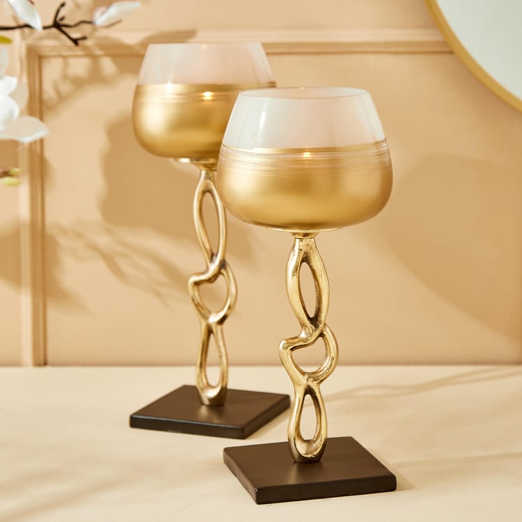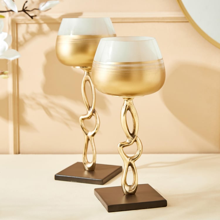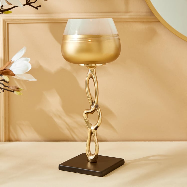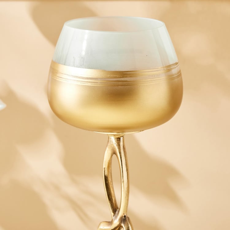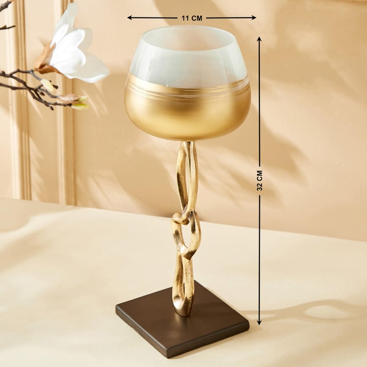 Elevate your decor with this stunning votive holder, featuring a stylish golden metal base. With its fresh and contemporary two-toned design, this piece exudes modern sophistication and charm. Crafted from lightweight aluminium, it seamlessly combines style and practicality. The unique colour blend adds a touch of elegance to any room, making it a perfect decorative accent for both the living room and foyer. Illuminate your space with candles while adding a chic and stylish statement to your home decor with this versatile and eye-catching votive holder.