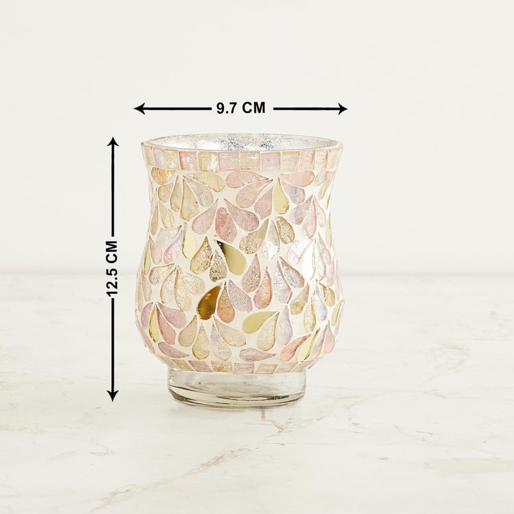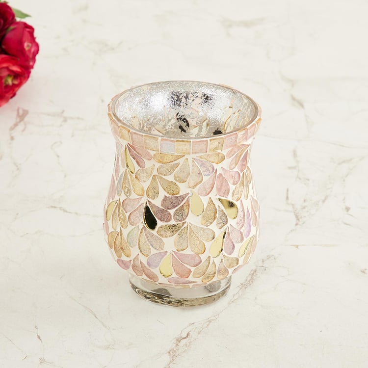 Gifting solutions are made easy with this unique votive holder that comes with a mosaic glass design and a textured rim, adding grace and charm to the homefront.