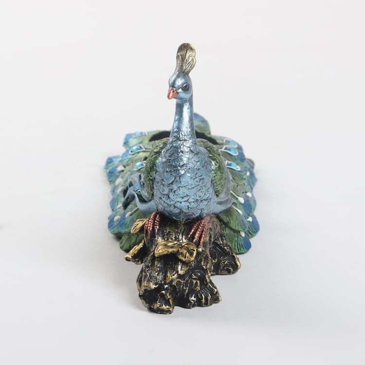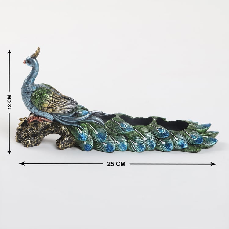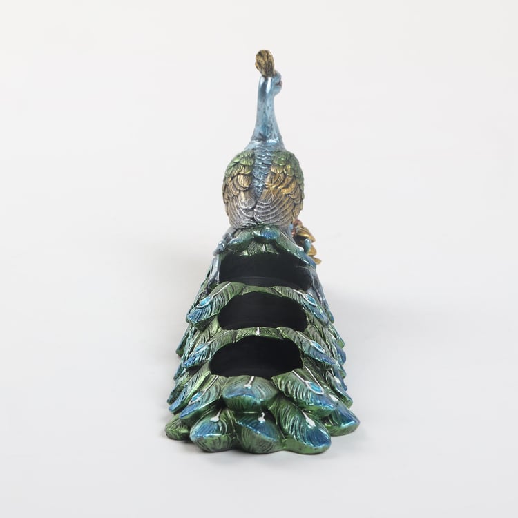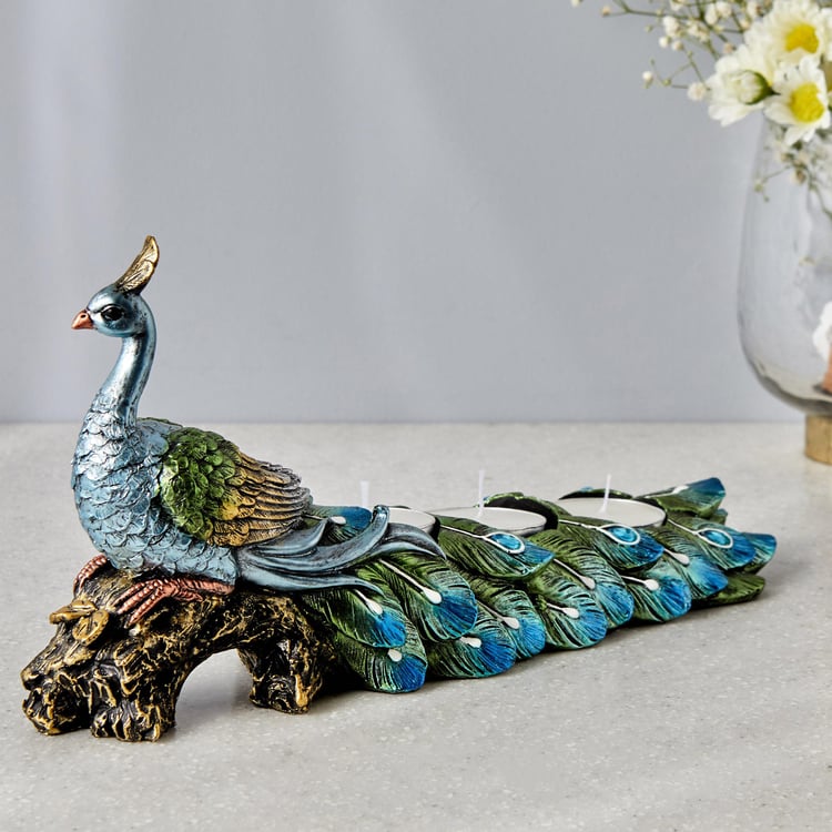 Give a finishing touch to your decor with this T-light set. It is made of polyresin which is durable and easy to maintain. The peacock figurine is perched on a branch for an elegant look. It includes 3 T-light holders. Add candles to this figurine to bring warmth to your space.