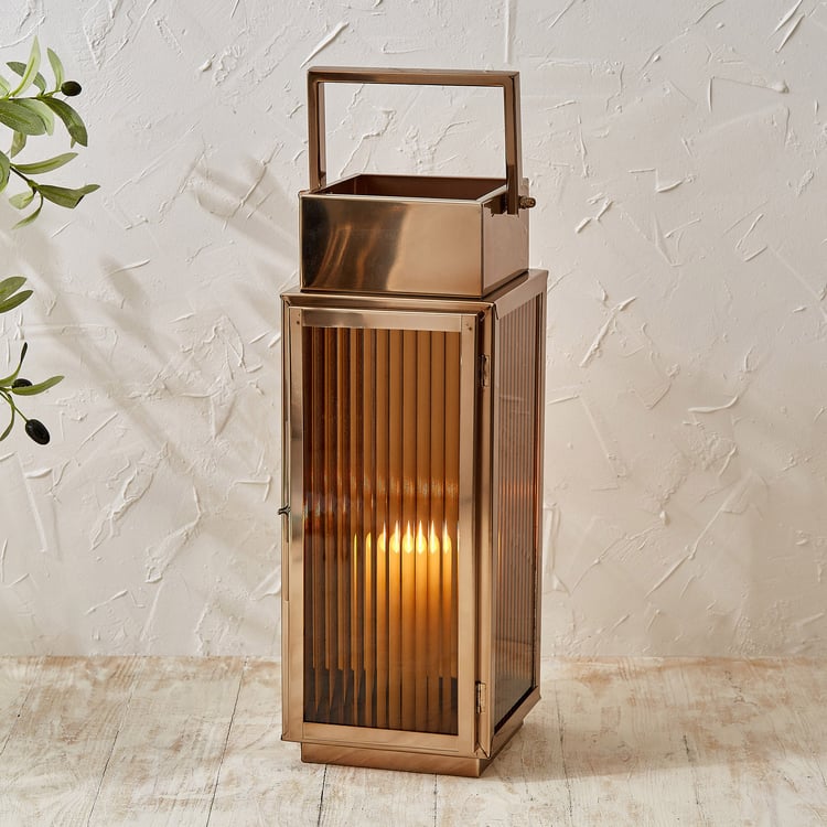 Add a warm, elegant glow to your space with this lantern. Featuring a sturdy aluminium frame and ribbed glass panels, it's perfect for candles and enhances both indoor and outdoor decor.