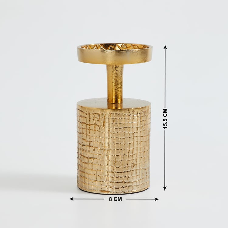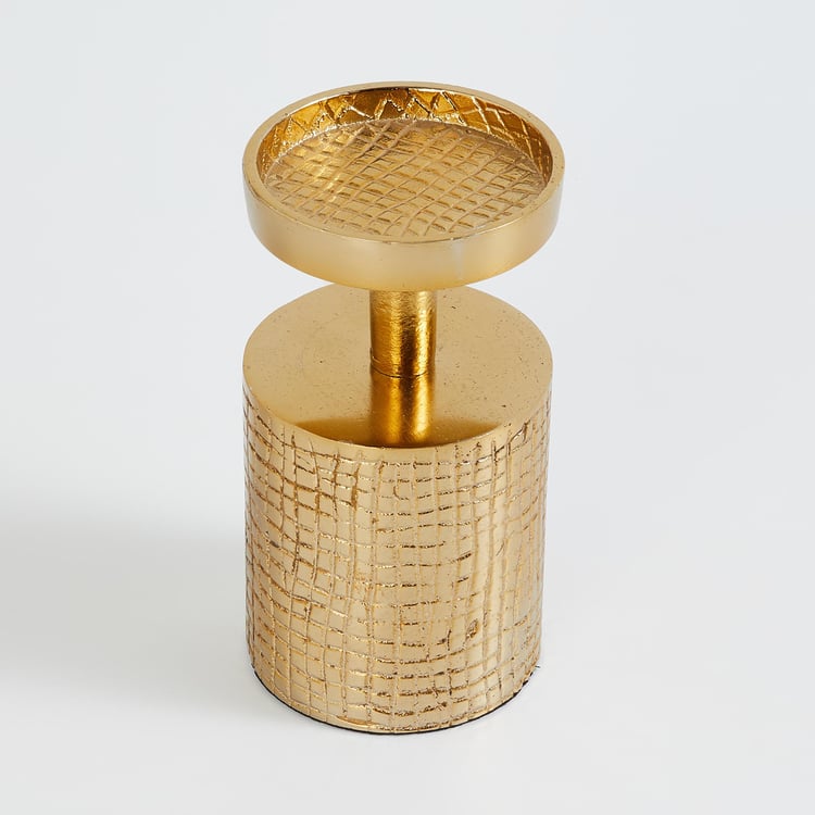 Bring a finishing touch to your decor with this candle holder. Made from metal, it features a cylindrical profile with a stand at the top to hold pillar candles. The textured surface adds to the visual intrigue.