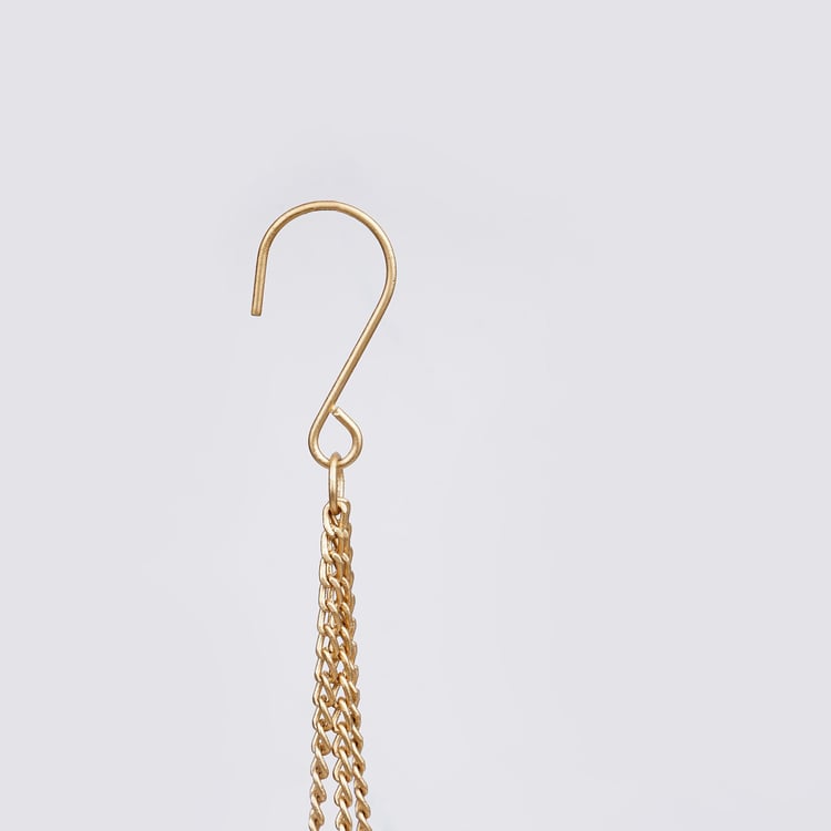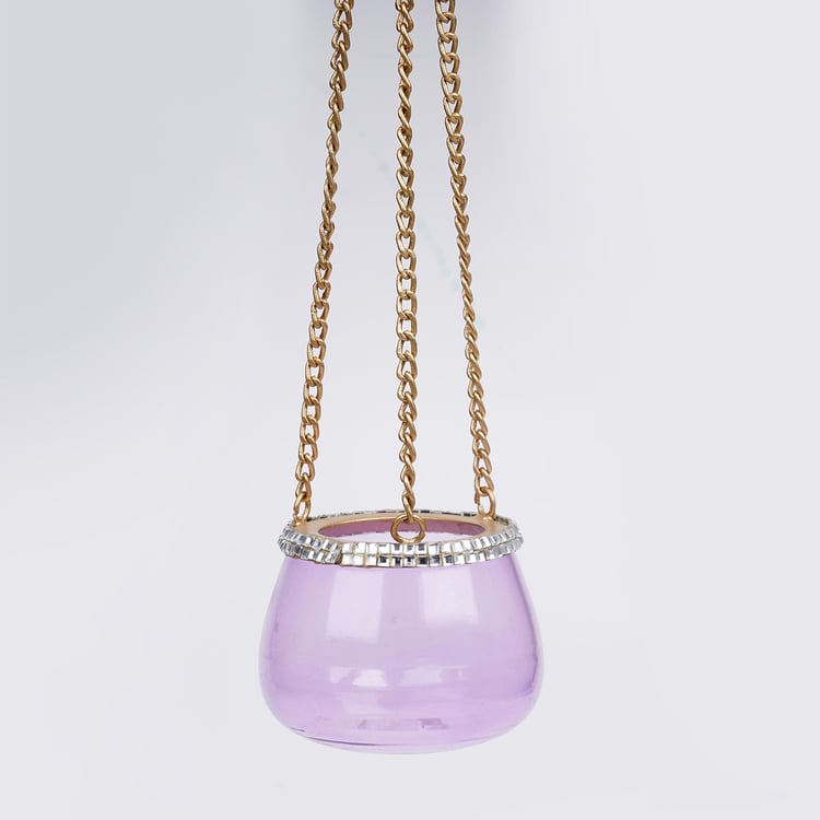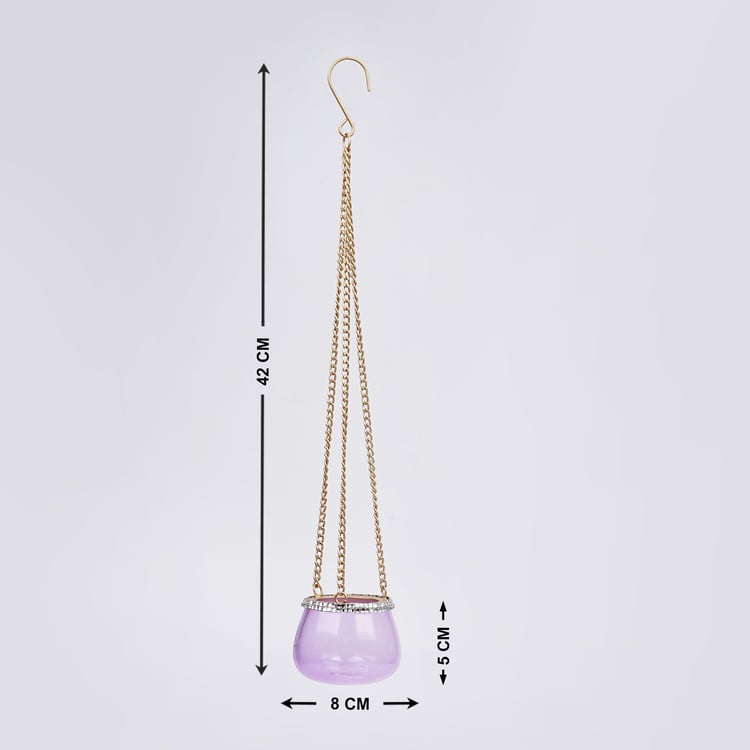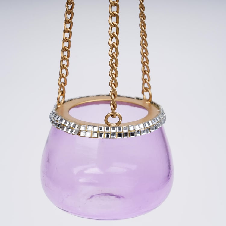 Jazz up your decor with this set of T-Light holders. Crafted by Indian artisans, this pair is made of glass with an aluminium rim that is decorated with stones to infuse a festive vibe. The aluminium chains with a hook make it easier to hang these T-Light holders from the ceiling or wall. Add T-lights to bring a warm, inviting glow.