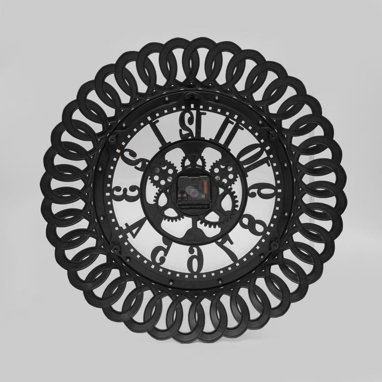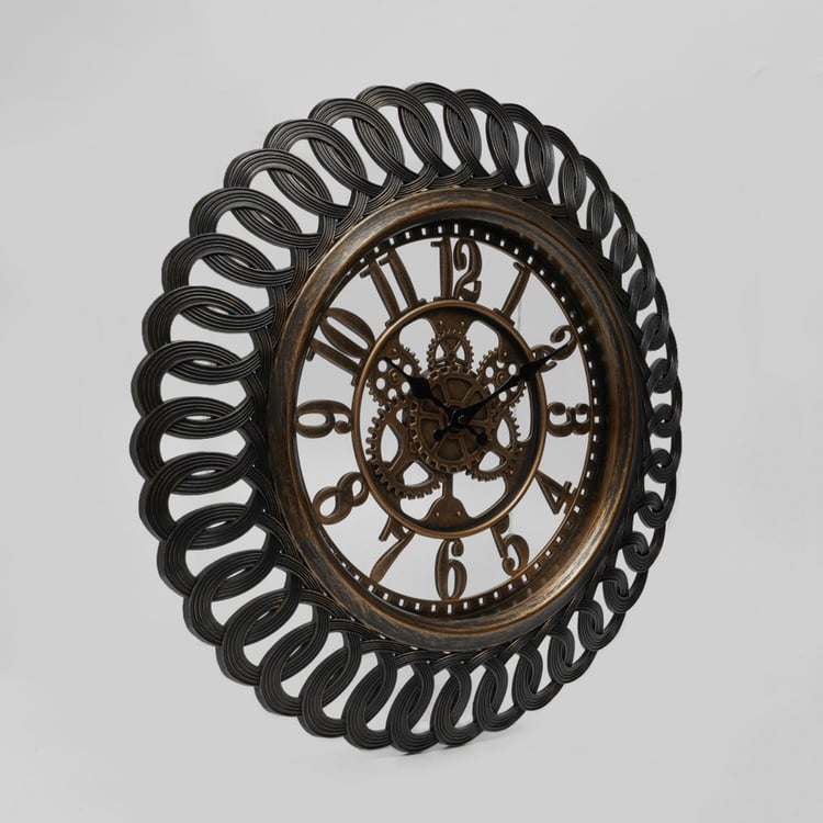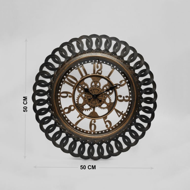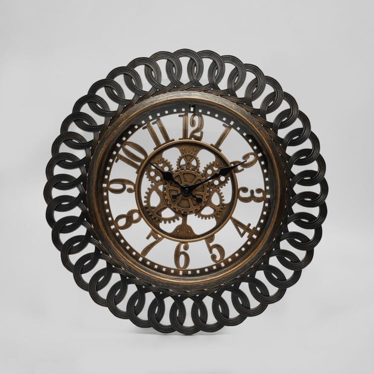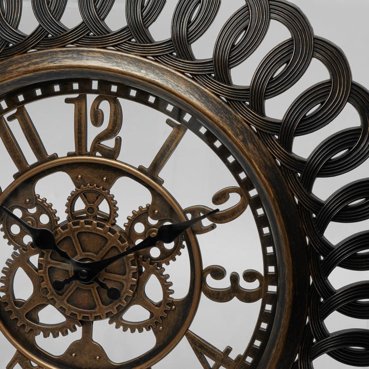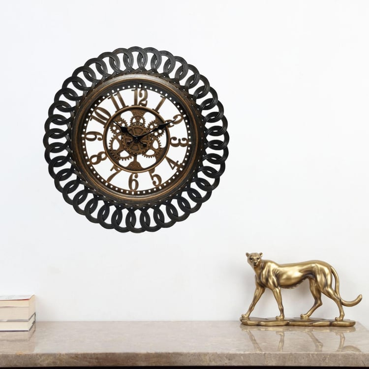 Designed into an antique wall accent with round analog function, this wall clock makes for an elegant timepiece.