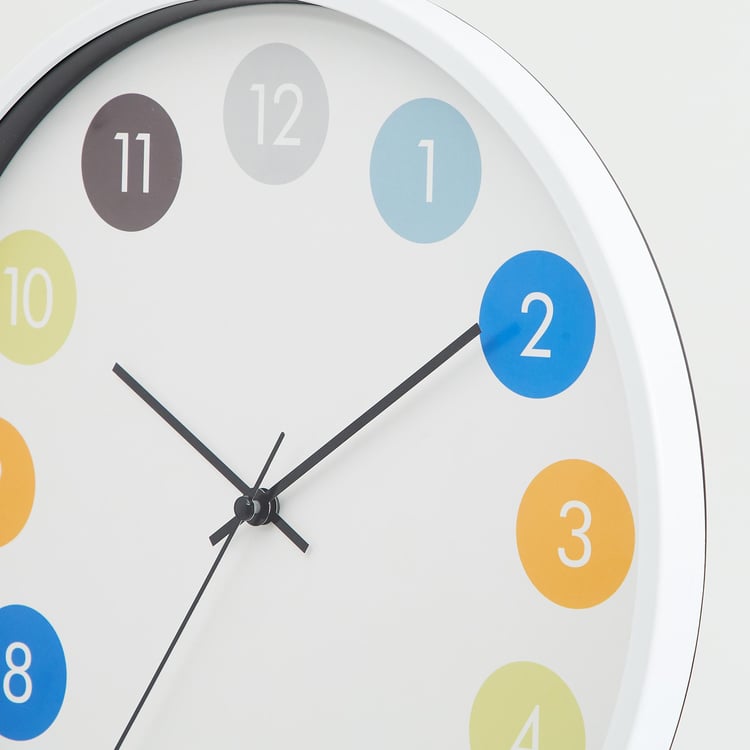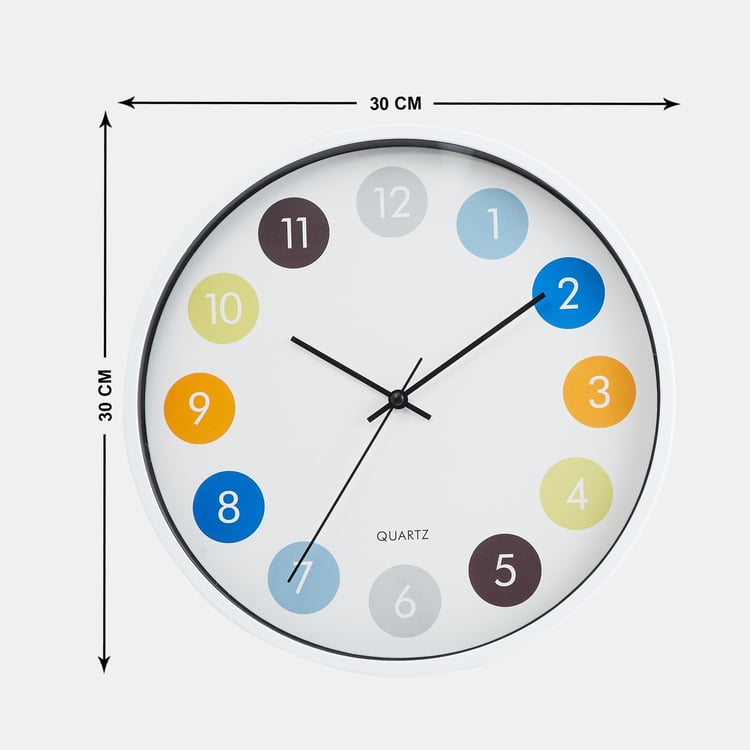 Spruce up decor with this wall clock. Made from plastic, this wall clock is durable and resistant to daily wear and tear. It features a round frame with Arabic numeral hour markers and circle prints.