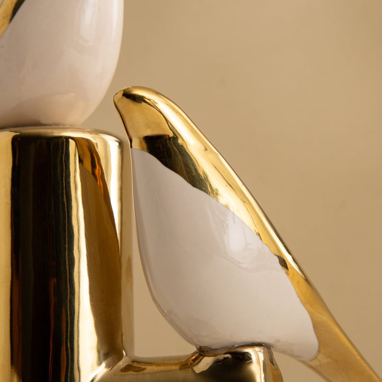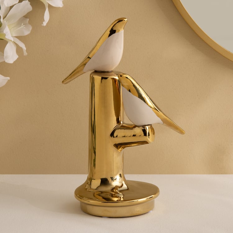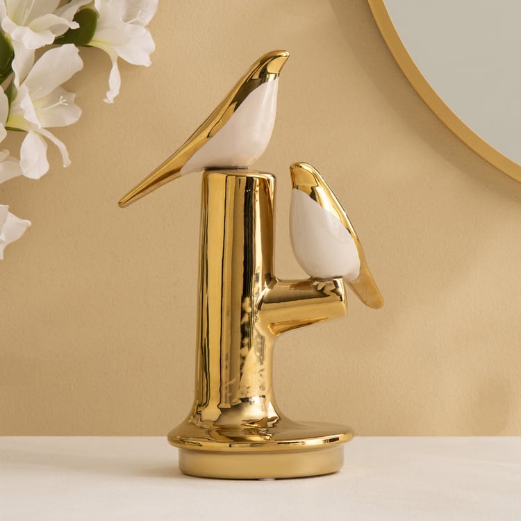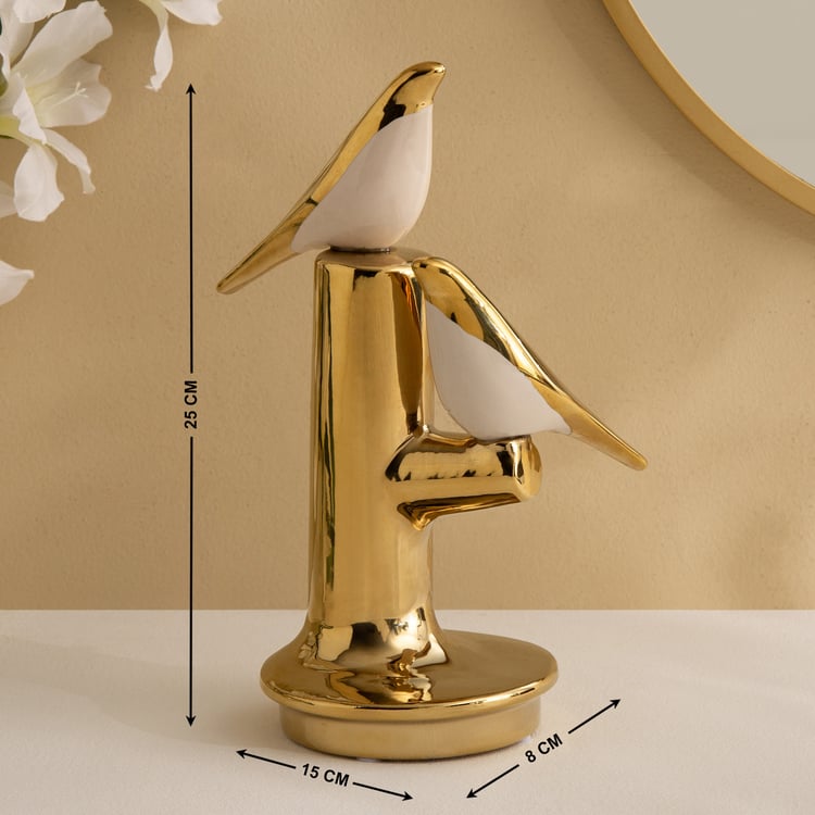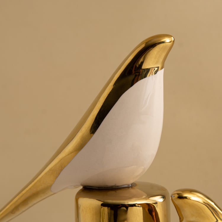 Add a serene touch to your decor with this bird figurine. Made of ceramic with a gleaming finish, it features two birds gracefully perched on a branch. The elegant design brings warmth and charm to consoles, shelves, or centre tables.