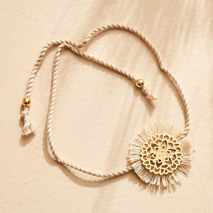 This Rakhi season celebrate the joyous bond with Home Centre. Presenting rakhis crafted from soft fabric, it features intricate Ganesha art that adds a touch of elegance and charm. The combination of art and delicate fabric makes this Rakhi both comfortable to wear and visually appealing.