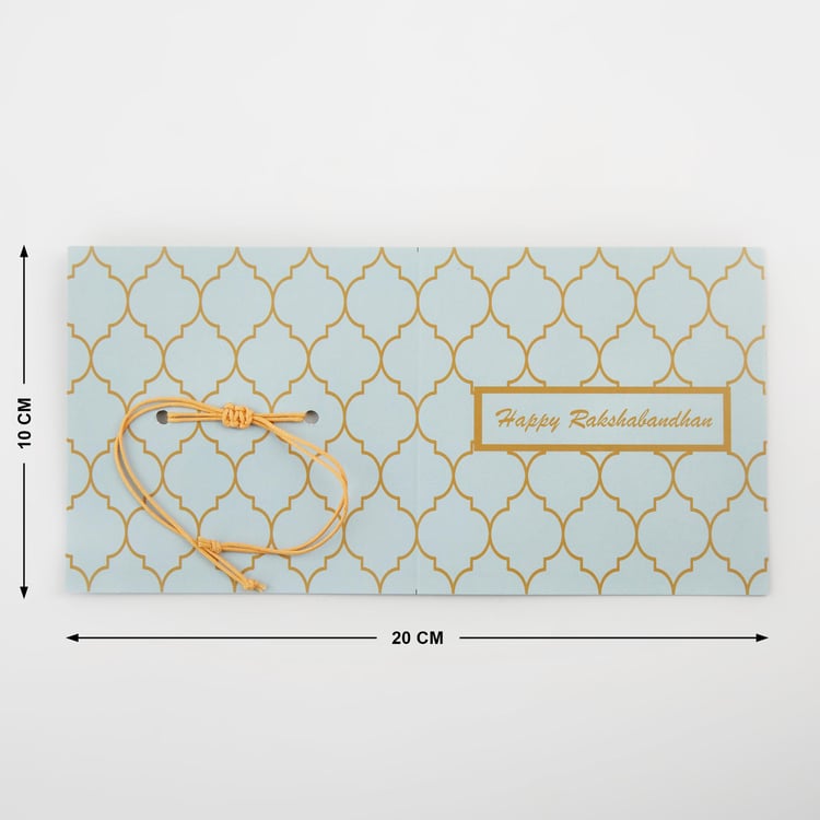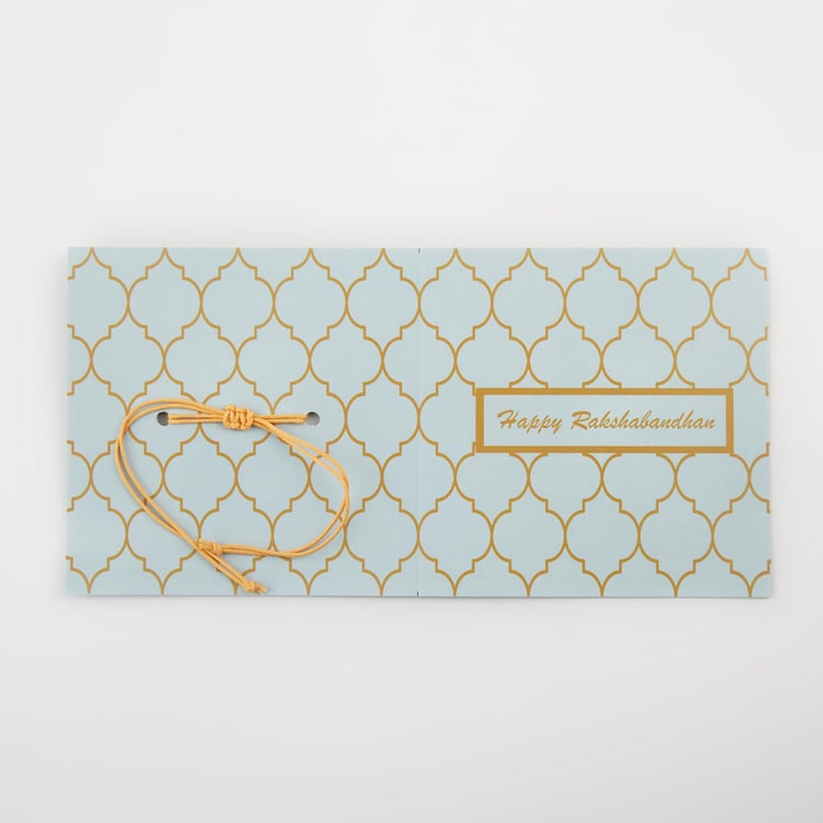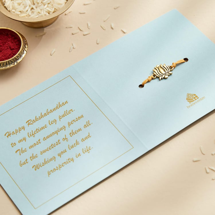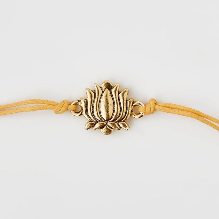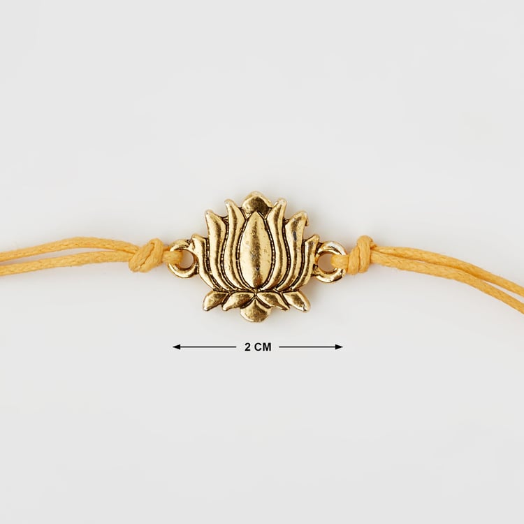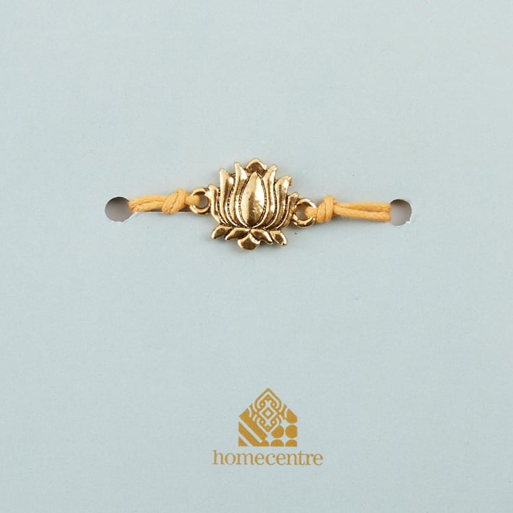 Celebrate your sibling bond with this rakhi. It is handcrafted with a lotus medallion made of alloy and thread for easy tying. This rakhi comes with a card and envelope that makes the ideal gift for this Raksha bandhan.