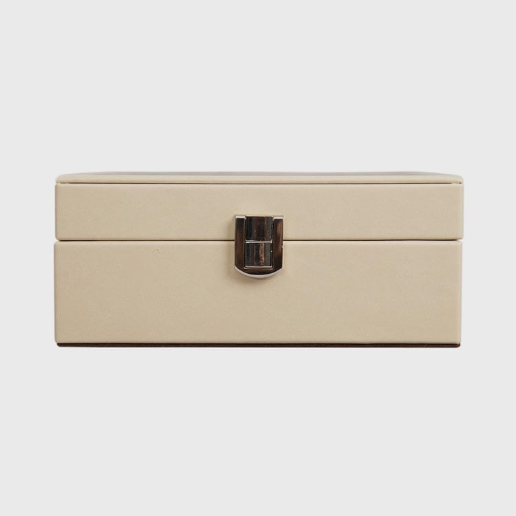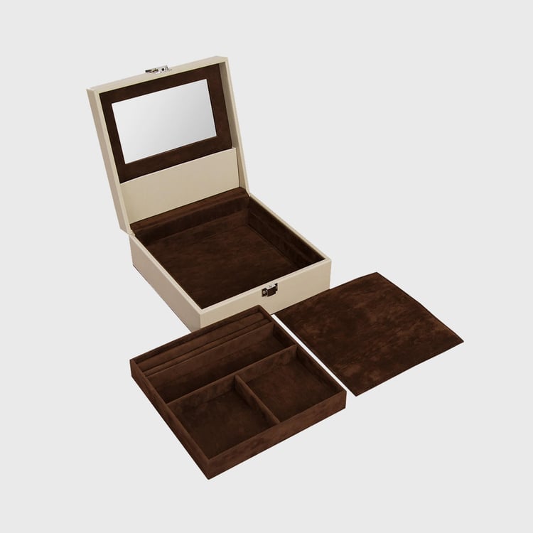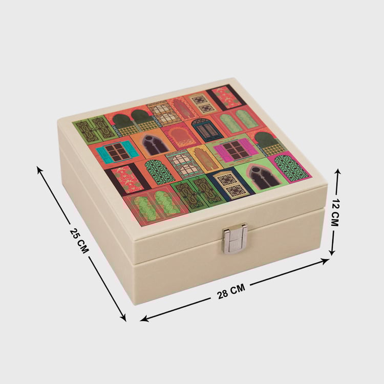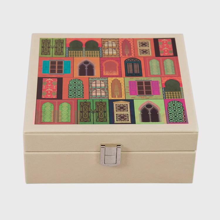 Looking for an impeccably stylish jewellery box for your most treasured possessions? This jewellery box made from faux leather with Mughal door prints on the lid lets you organise your jewellery in its neatly segregated cavities. The design on this jewellery box is classic, simple and yet astoundingly rich and will never go out of style.