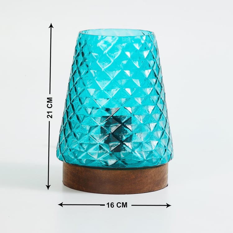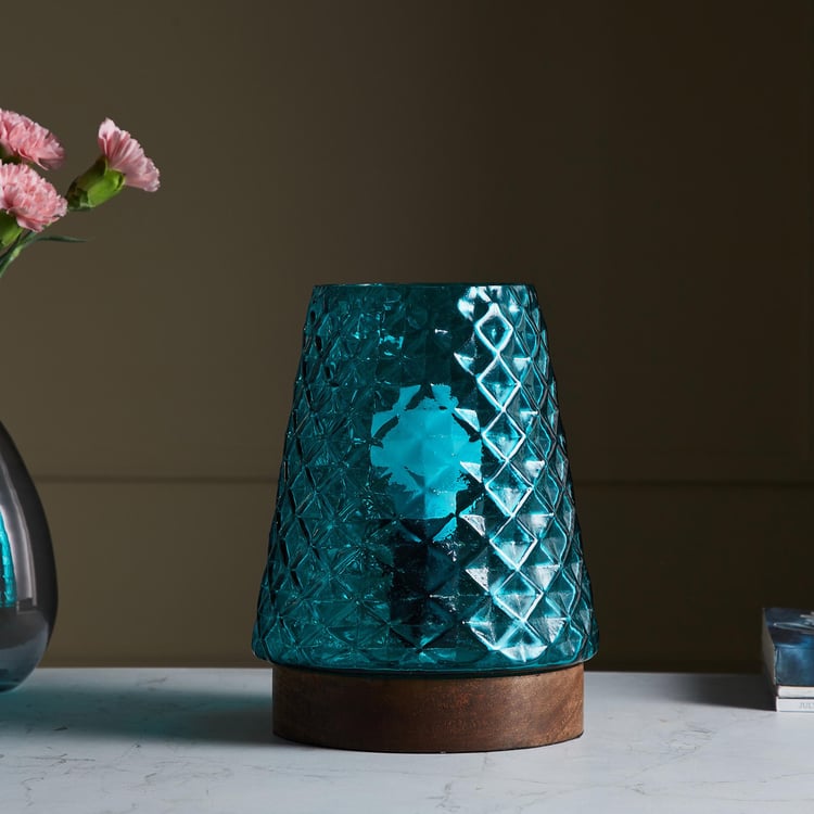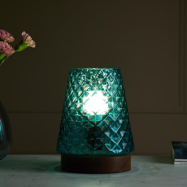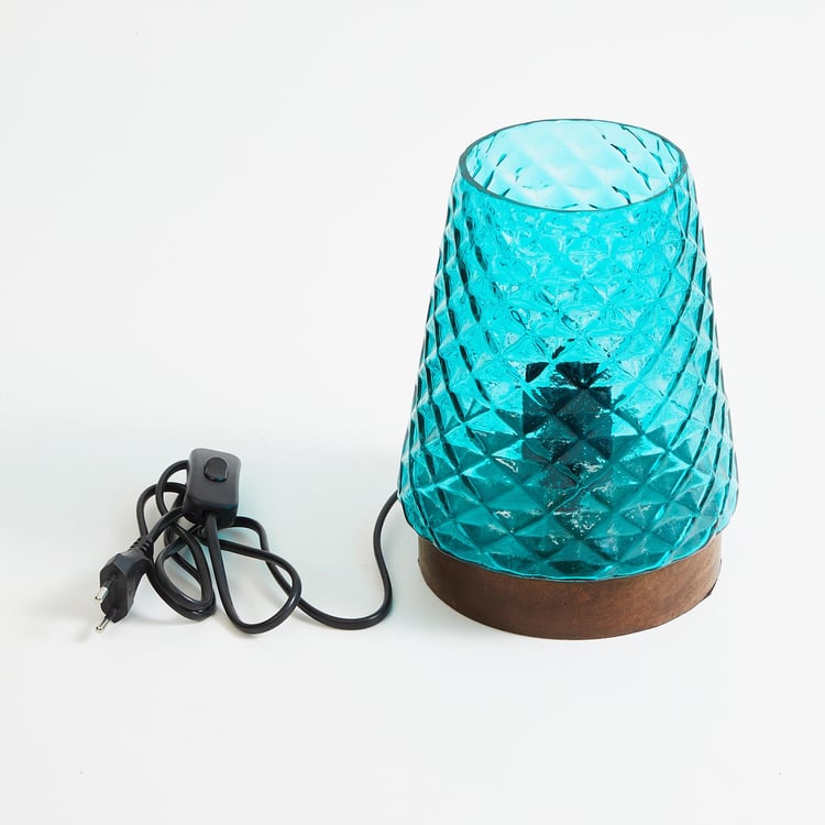 Accentuate your decor with this table lamp. It features a tapering shade made of glass with embossed patterns for added flair. The shade is set on a wooden base and includes a bulb holder.