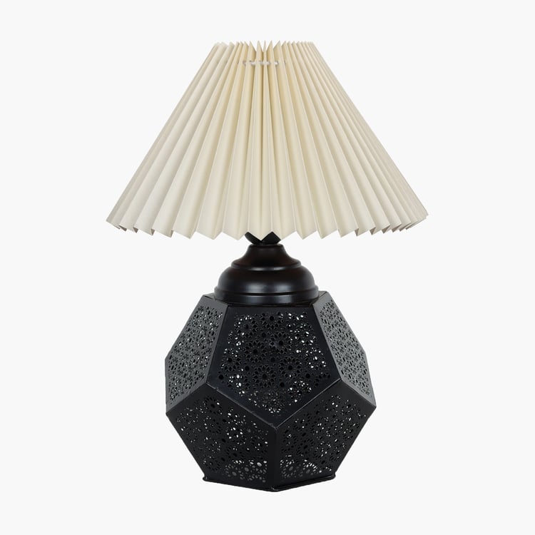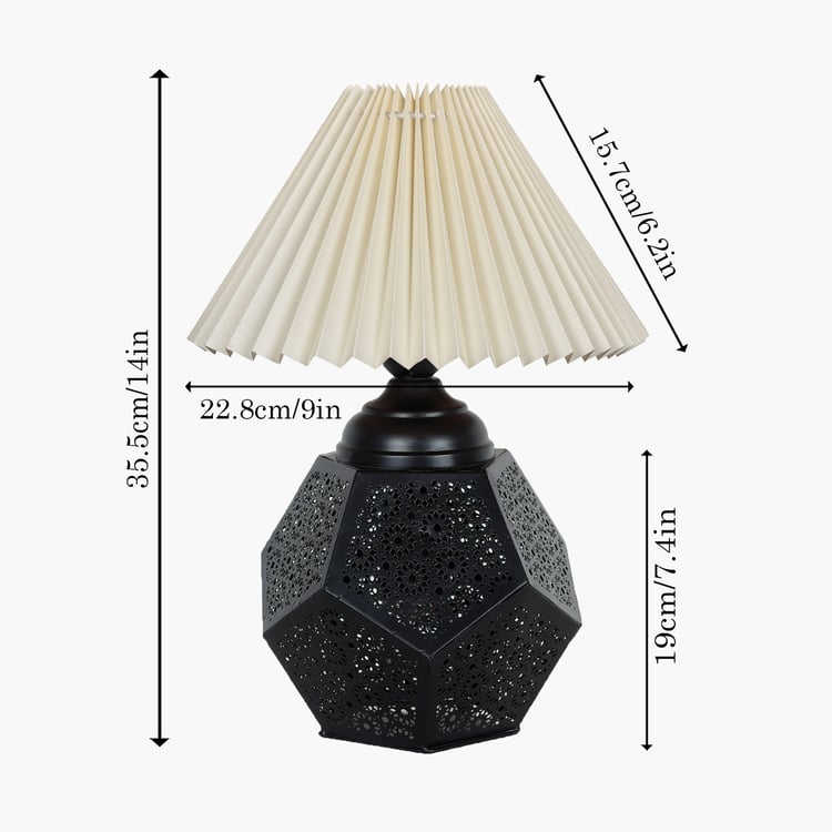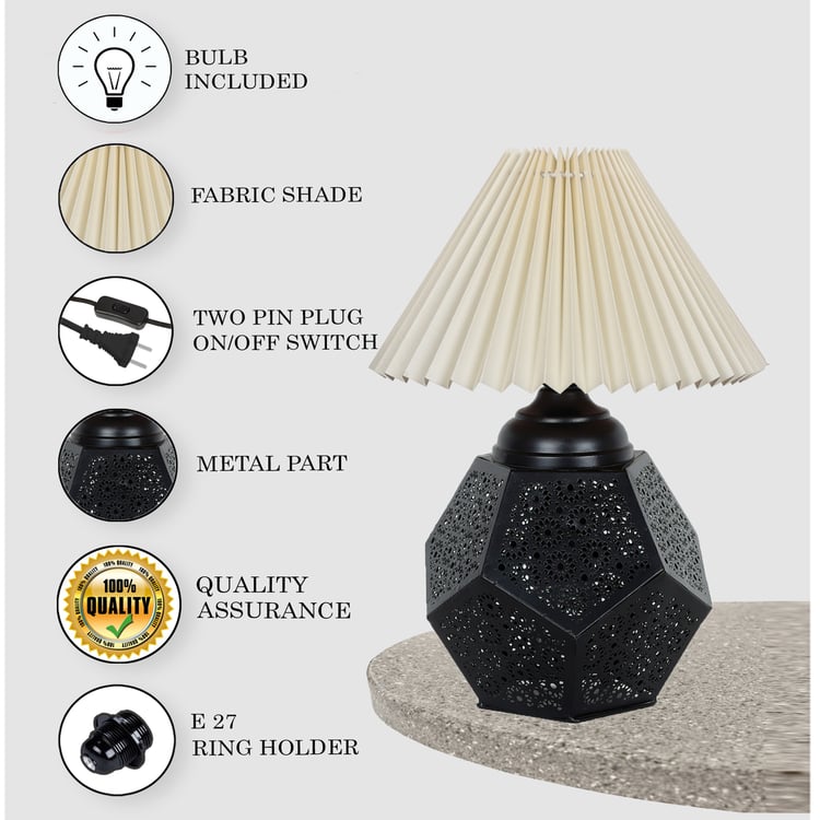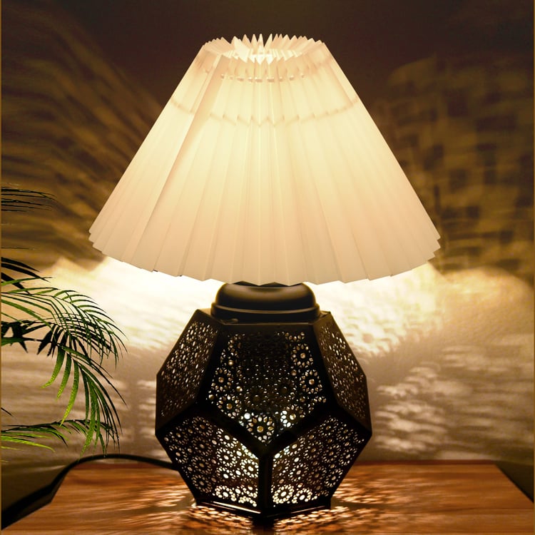 This elegant table lamp combines modern and traditional design with a metal base featuring intricate geometric cutouts that create captivating light patterns. A classic white pleated fabric shade tops the durable metal base. It includes a convenient 2-pin plug with an E27 ring holder for easy bulb installation (bulb included), and complements bedside tables, living rooms, or offices with its versatile style.