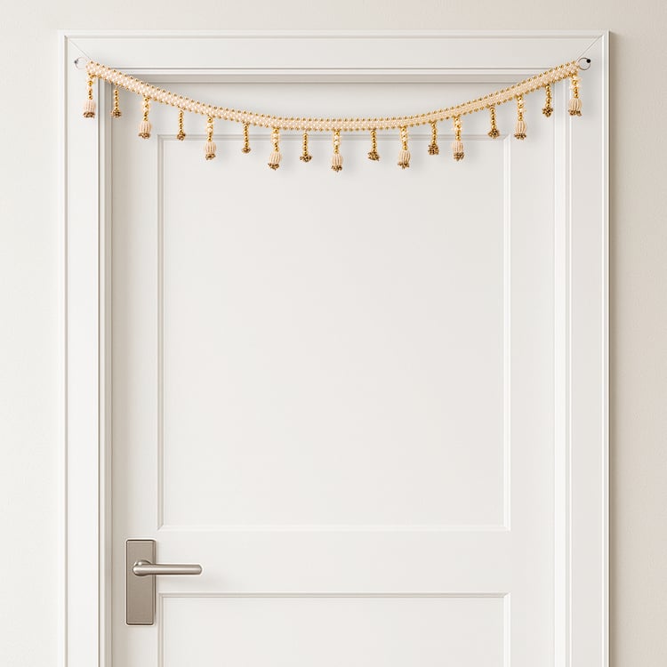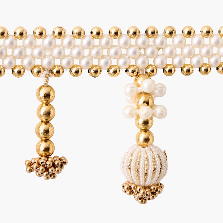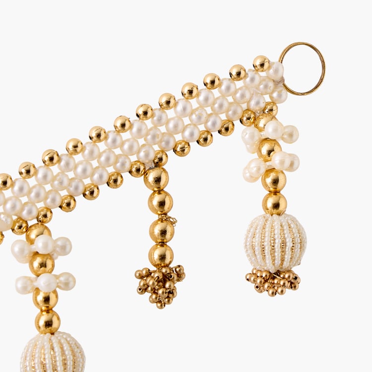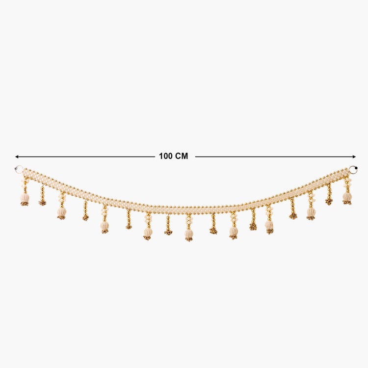 Welcome prosperity with this elegant door toran, crafted from plastic, metal, and pearl beads. Featuring intricate jhumka hangings and side rings for easy hanging, it blends traditional charm with modern flair.