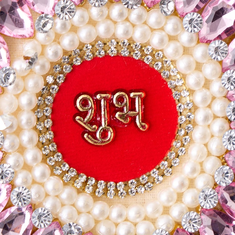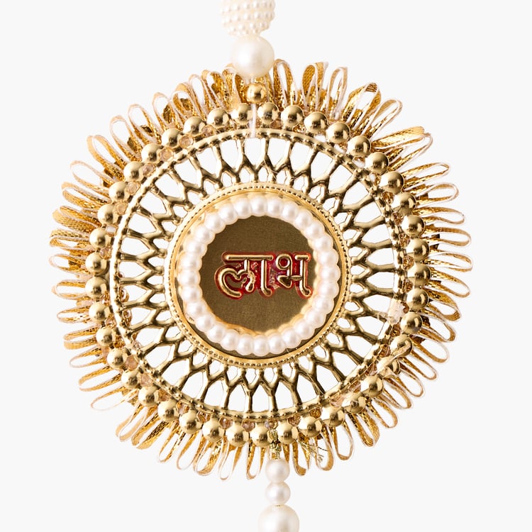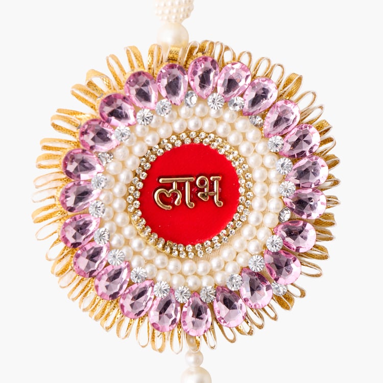 Welcome positivity with these embellished Shubh Labh reversible door latkans. Crafted from plastic, pearls, and metal, they bring festive elegance and traditional charm to your doorway.