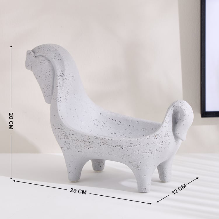 A charming sculptural piece, this bowl brings playful character to your decor. It is made of polyresin with a horse-inspired form, textured finish, and a recessed bowl for holding small items or dry arrangements. This decor piece is ideal for consoles, coffee tables, entryways, or shelves.