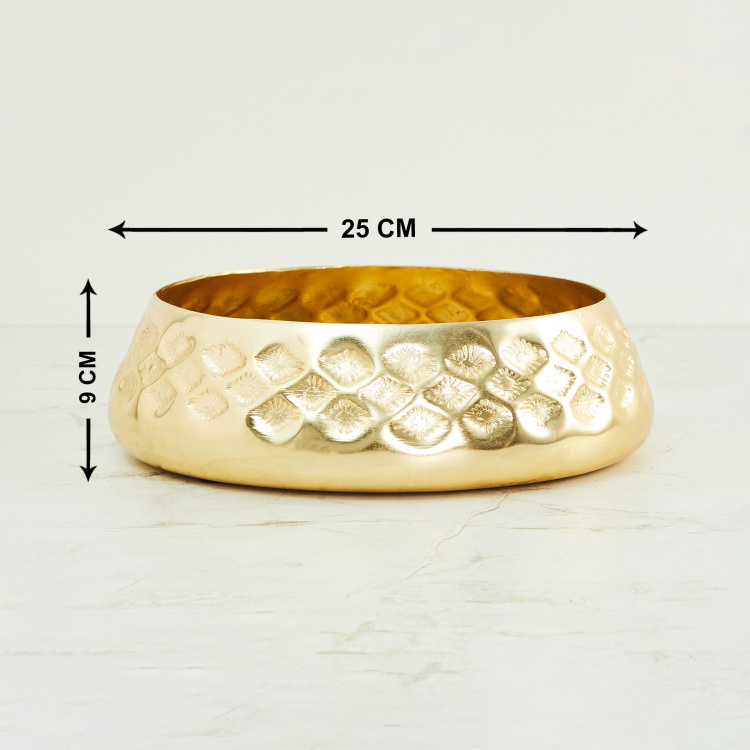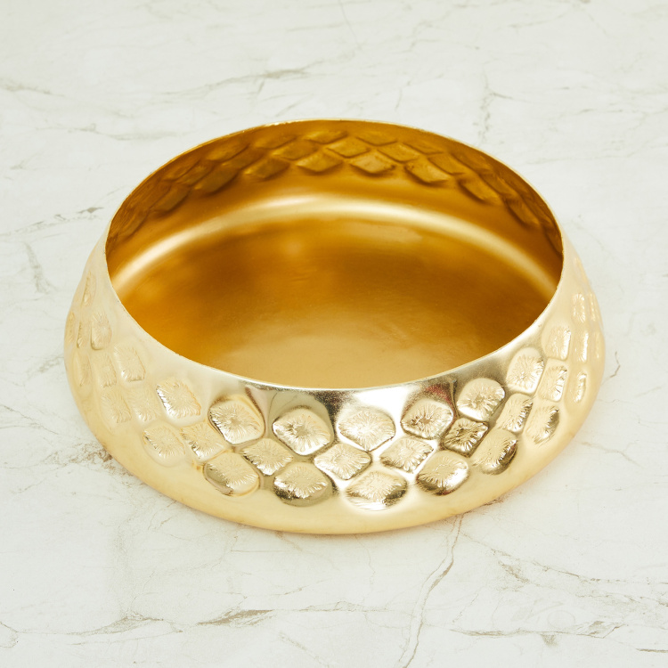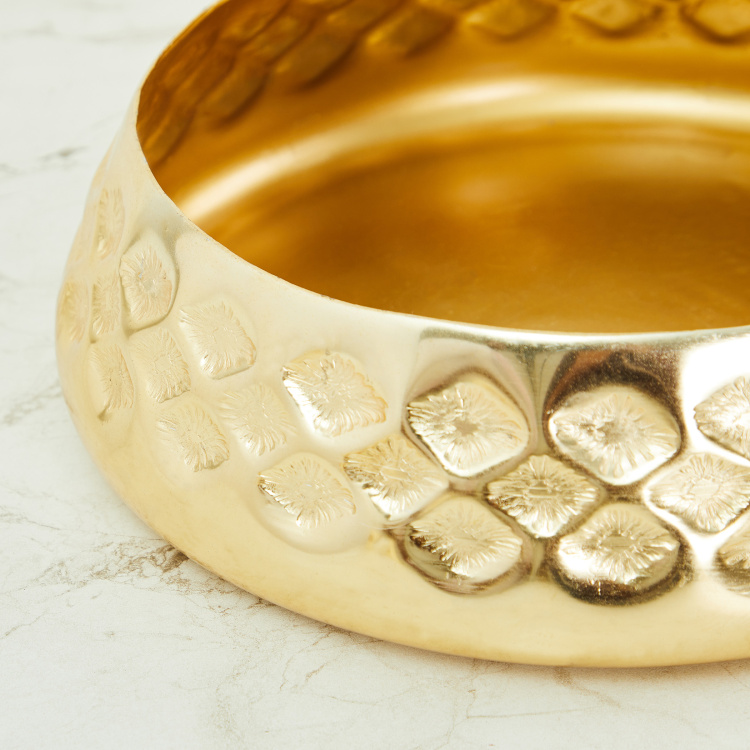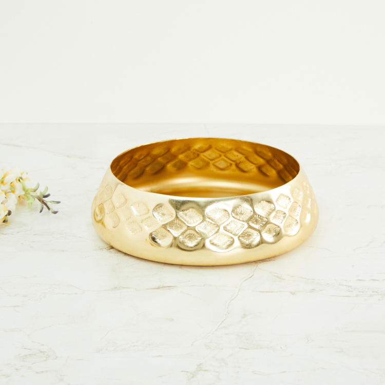 Adorned by an embossed design and a gold-tone finish, this round bowl is a great addition to your living room decor for a refreshing appeal. Place this alongside your sofa and enhance the overall interior of your homefront.
