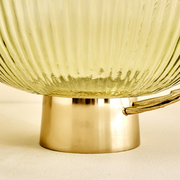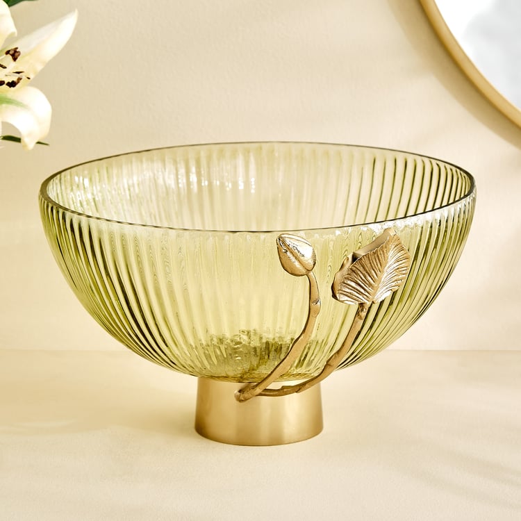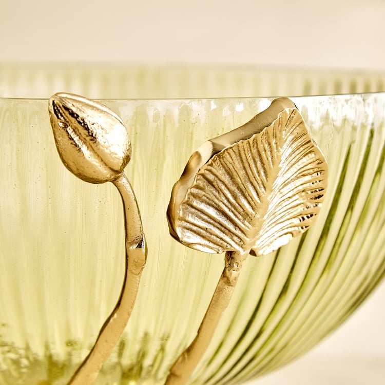 This decorative bowl features glass leaf and flower bud detailing with a sturdy metal base. It offers elegant design, durable craftsmanship, and a refined accent for tabletops.