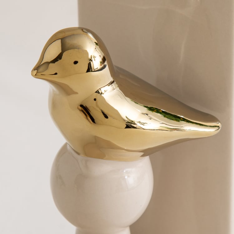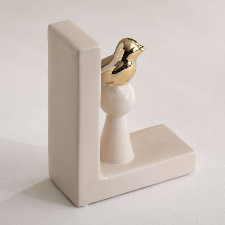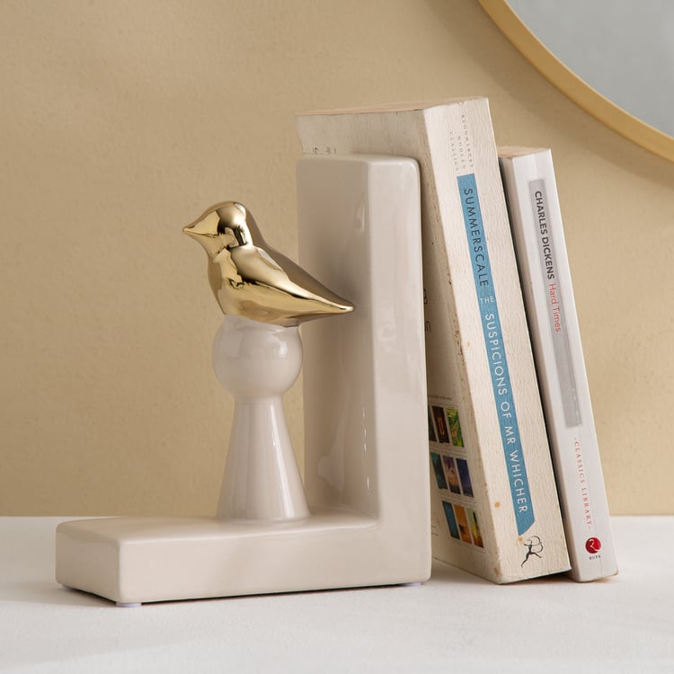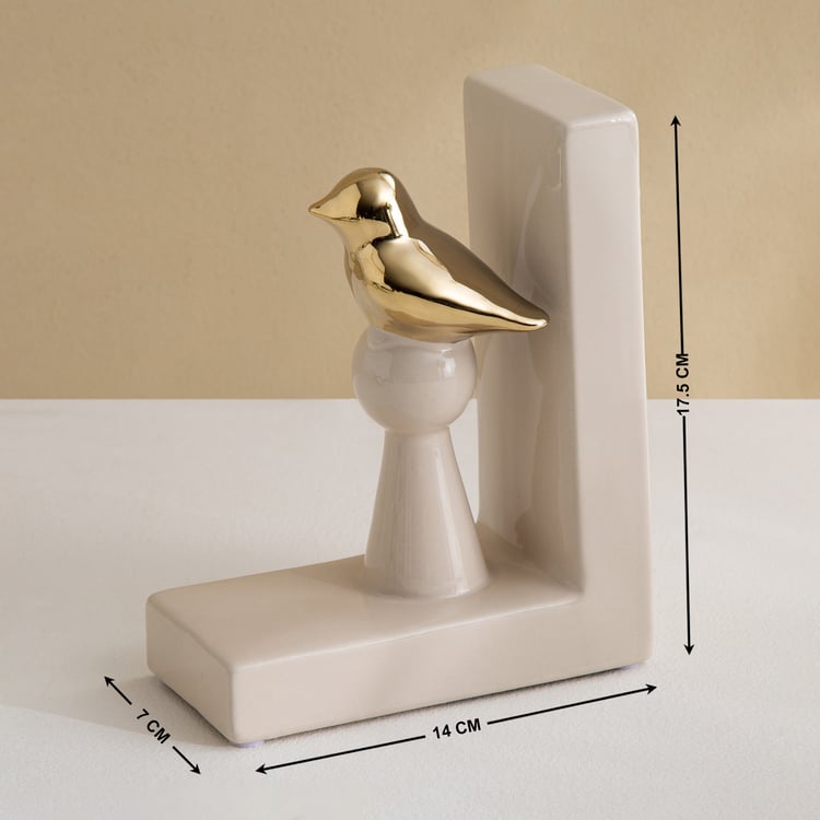 Add a graceful touch to your bookshelf with this bookend. Crafted from ceramic, it features a sleek design with a charming bird perched on top. Both decorative and functional, it keeps your books neatly in place.
