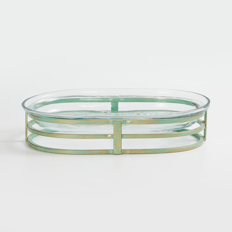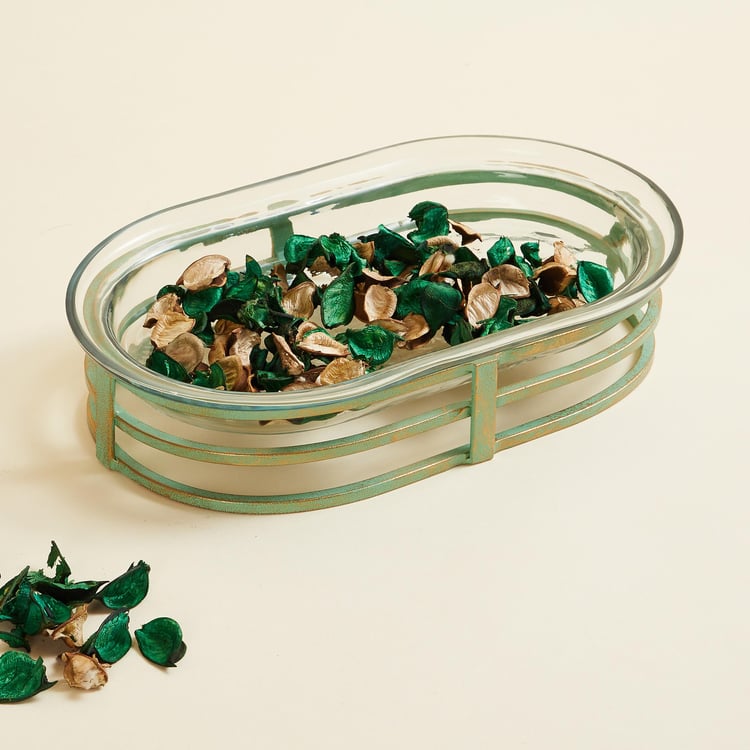 Give a finishing touch to your space with this table accent. It includes a decorative glass platter with a hammered finish in an oval shape. A metal stand with a patina finish elevates the look.