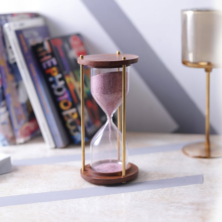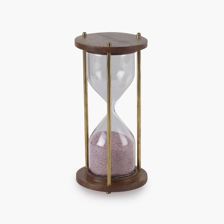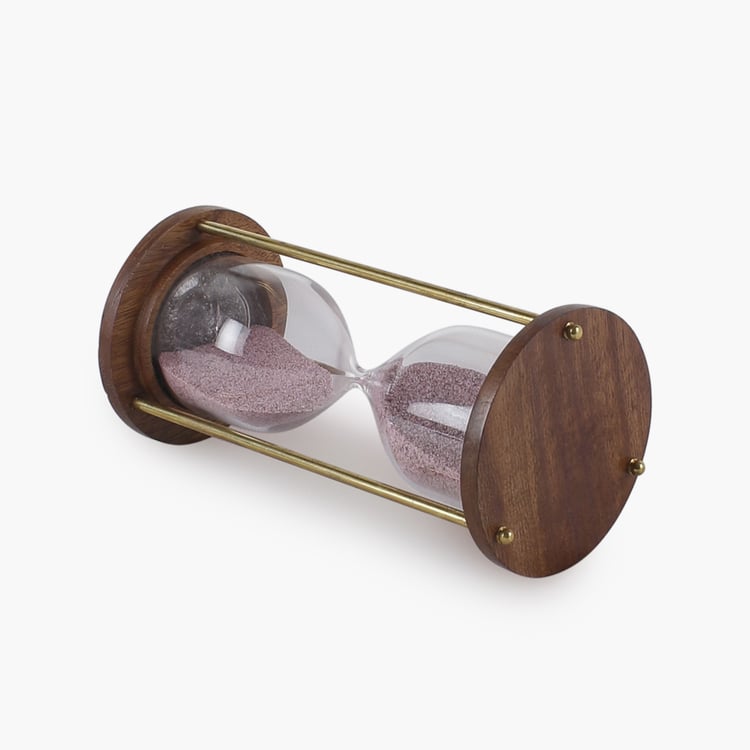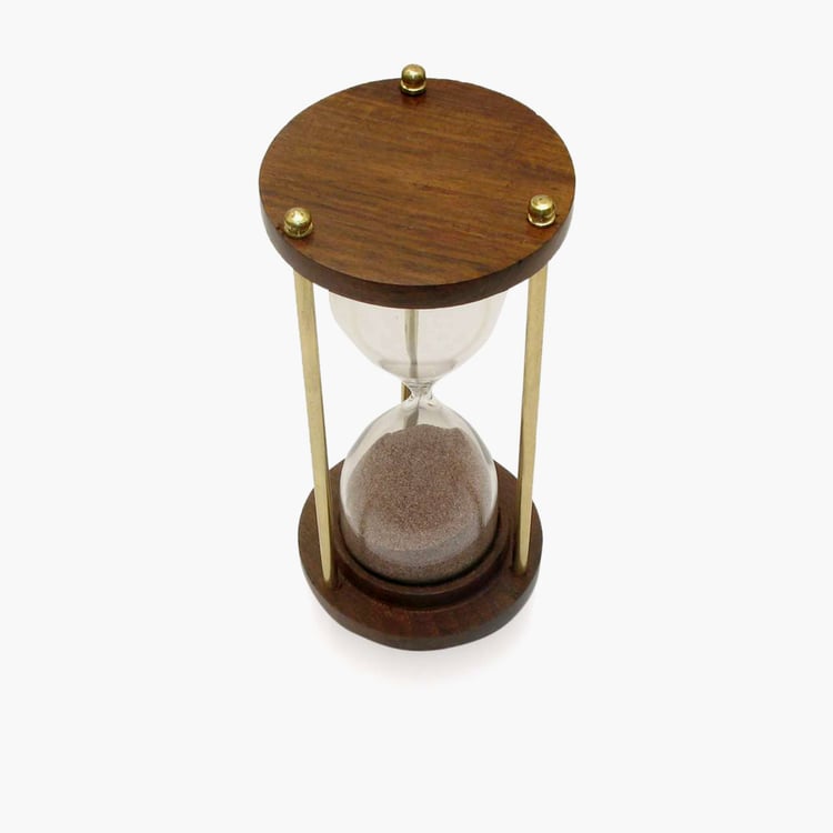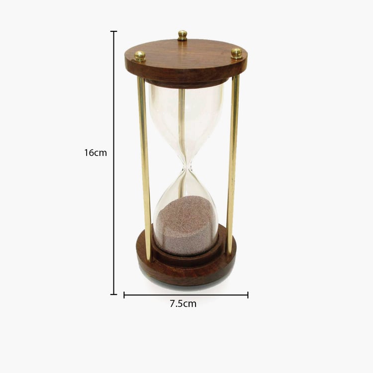 Add a touch of timeless elegance to your decor with this sand timer. Crafted with a sleek wooden frame with brass accents, this hourglass offers a stylish way to measure time, making it perfect for both functional and decorative use. With a 5-minute timer, it's ideal for short activities like cooking, meditation, or just adding a unique accent to your desk or shelf.