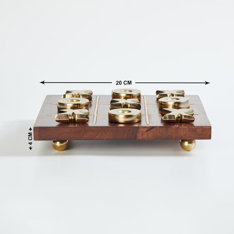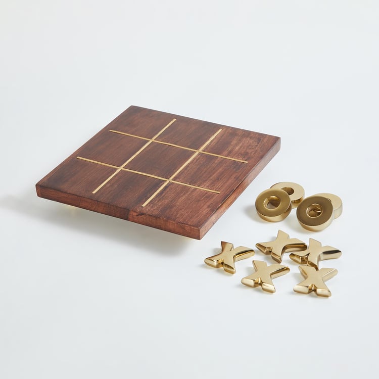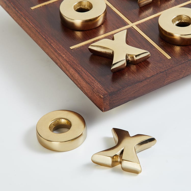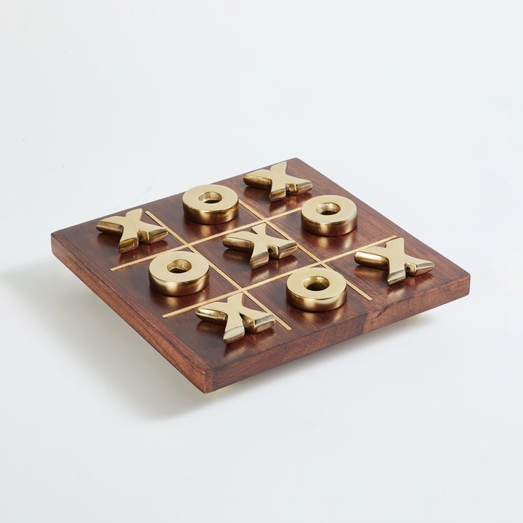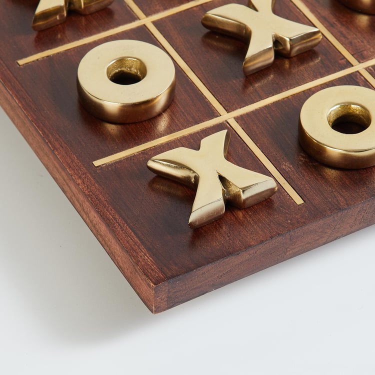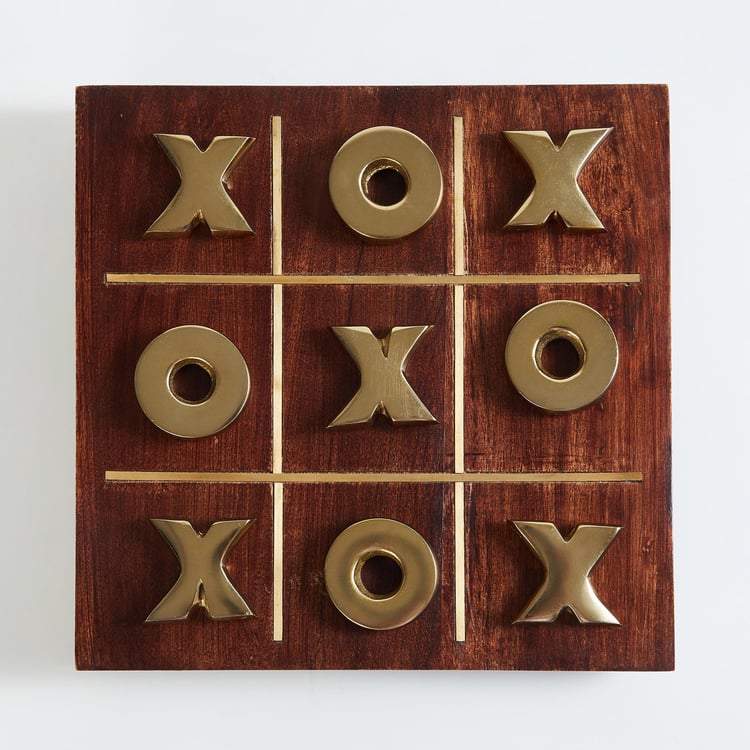 Accentuate your decor with this table accent. It features a tic tac toe board made of wood with X and O made of iron and an aluminium base. It is an ideal addition to your coffee table.