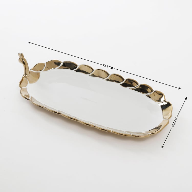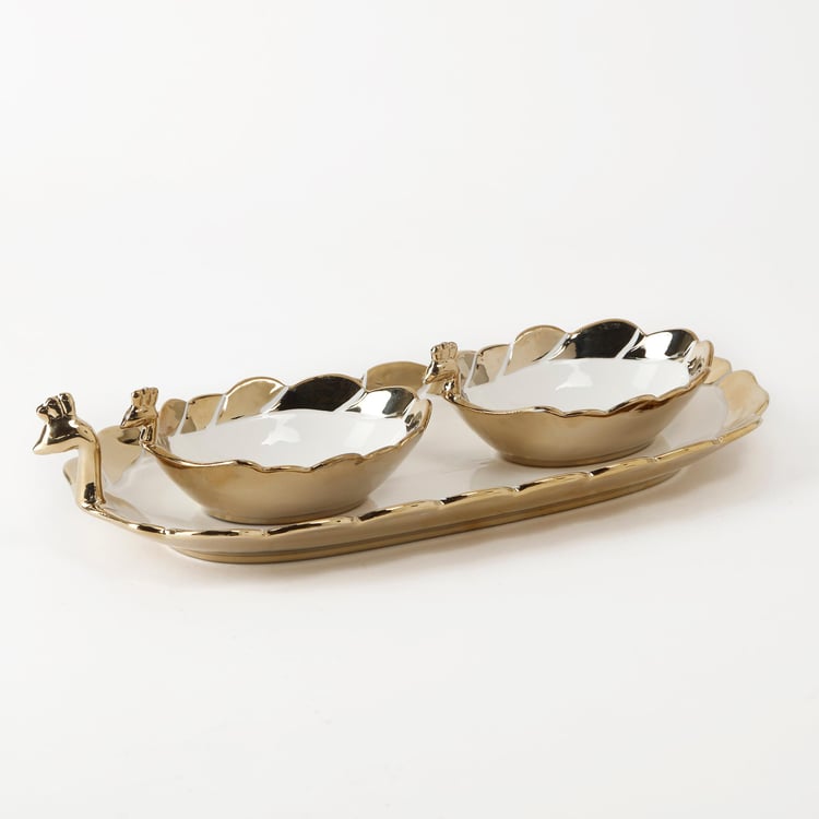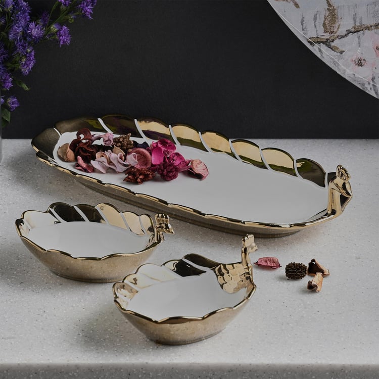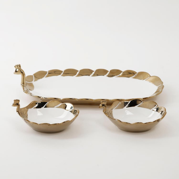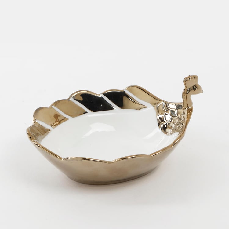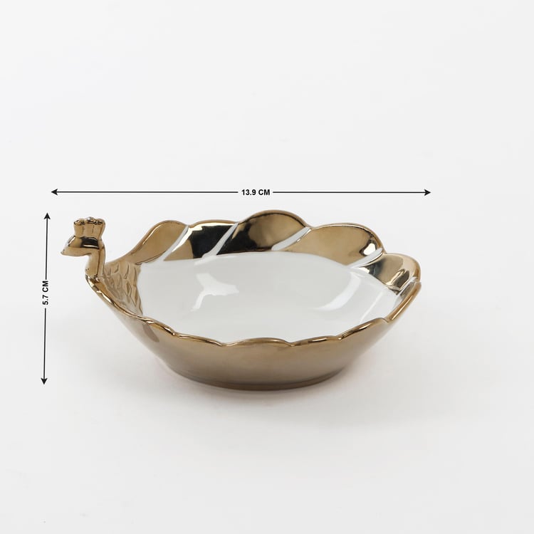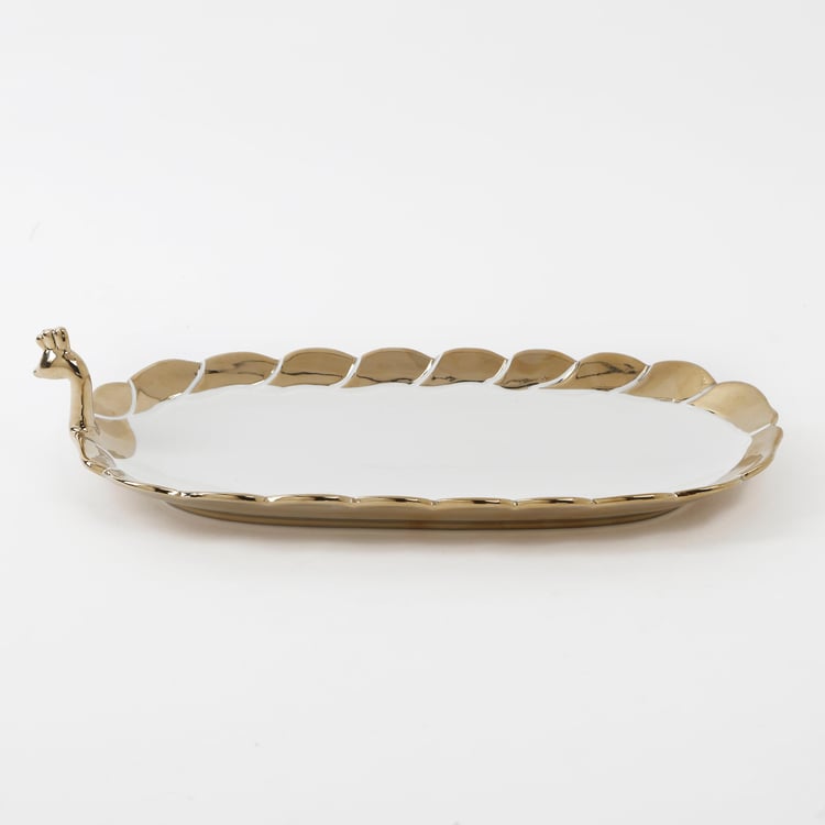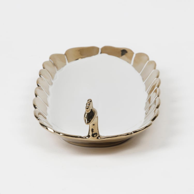Adding a graceful charm to your home decor, this peacock platter is the perfect way to bring in a sophisticated look this festive season. Premium gold and glossy finish, with carve and embossed designVery affordableThese are hand carved with finest quality of Porcelain