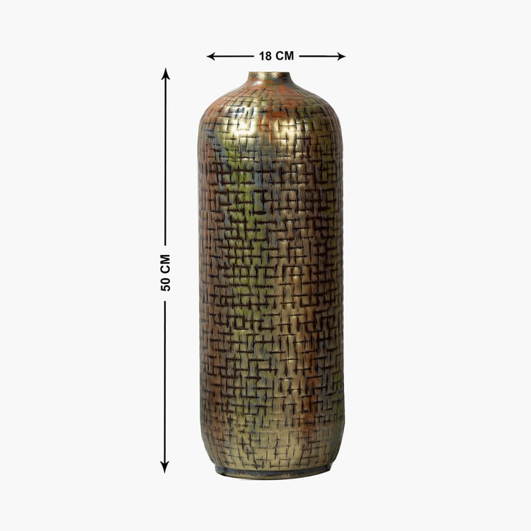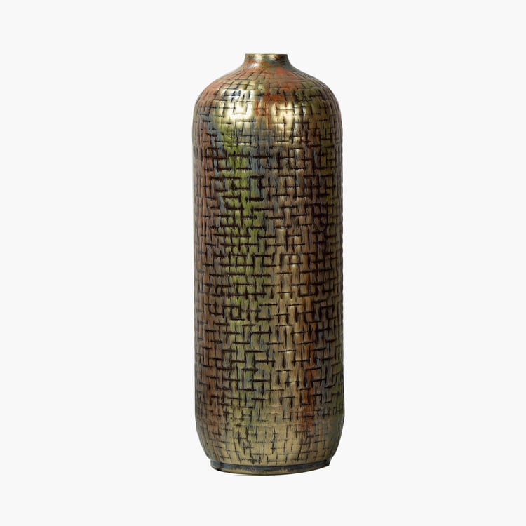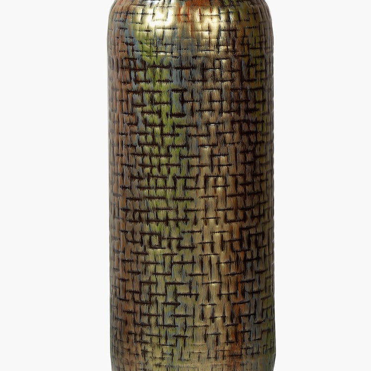 Add a retro flair to your decor with this vase. Made of metal, it features a cylindrical profile with etched detailing on the exterior and a narrow neck. Display it on its own or add natural or artificial flowers to spruce the look.
