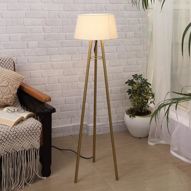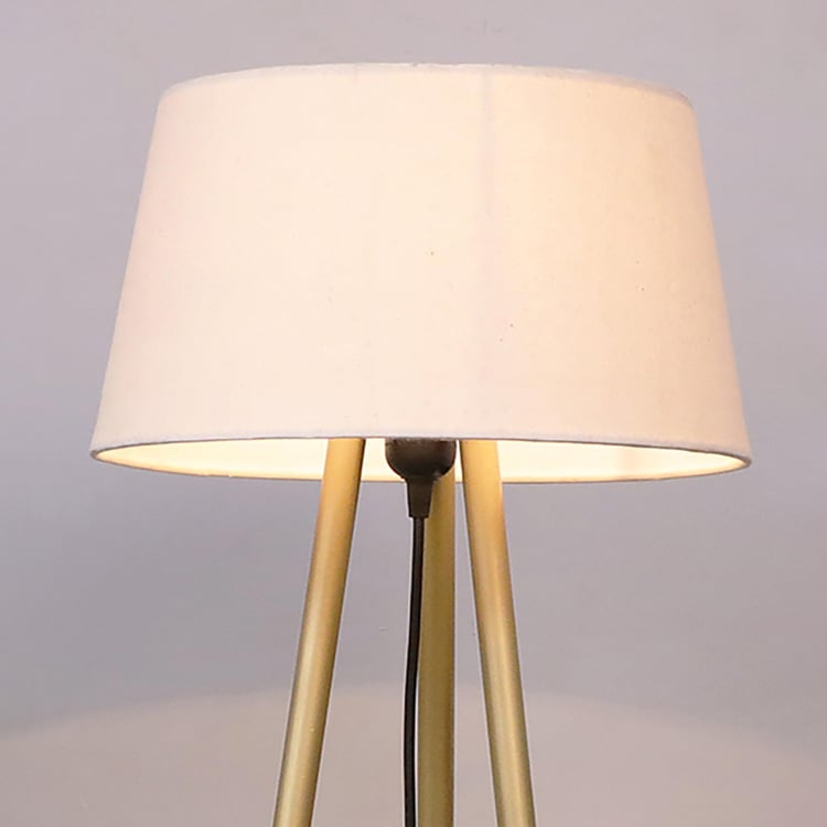 Golden tripod lamp with khadi shade. It comes with 2 pin plug and an E-27 thread base. Bulb not included.