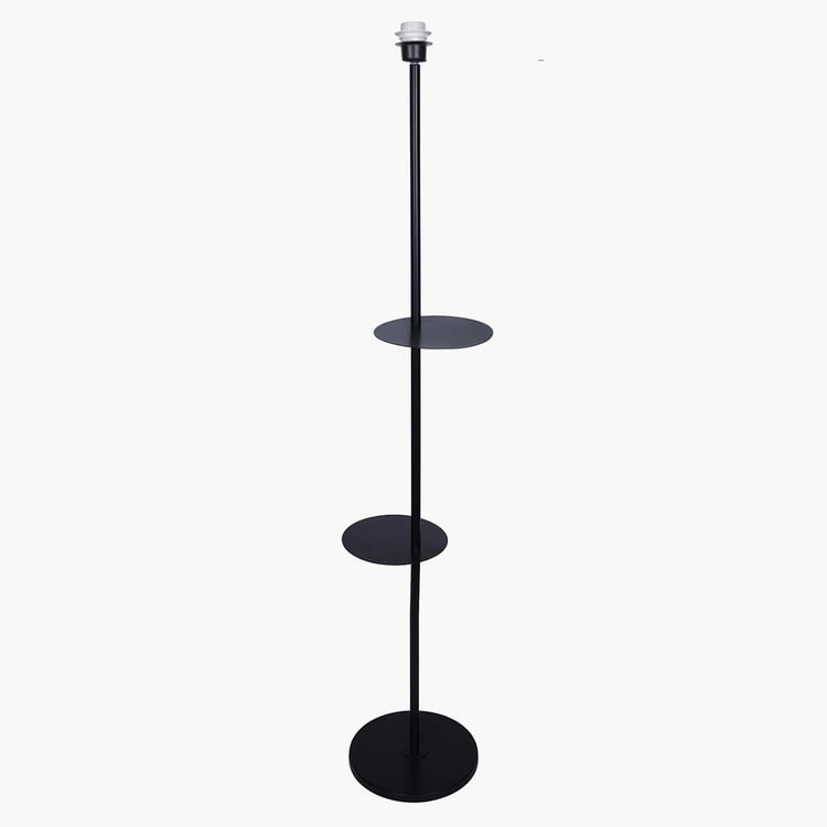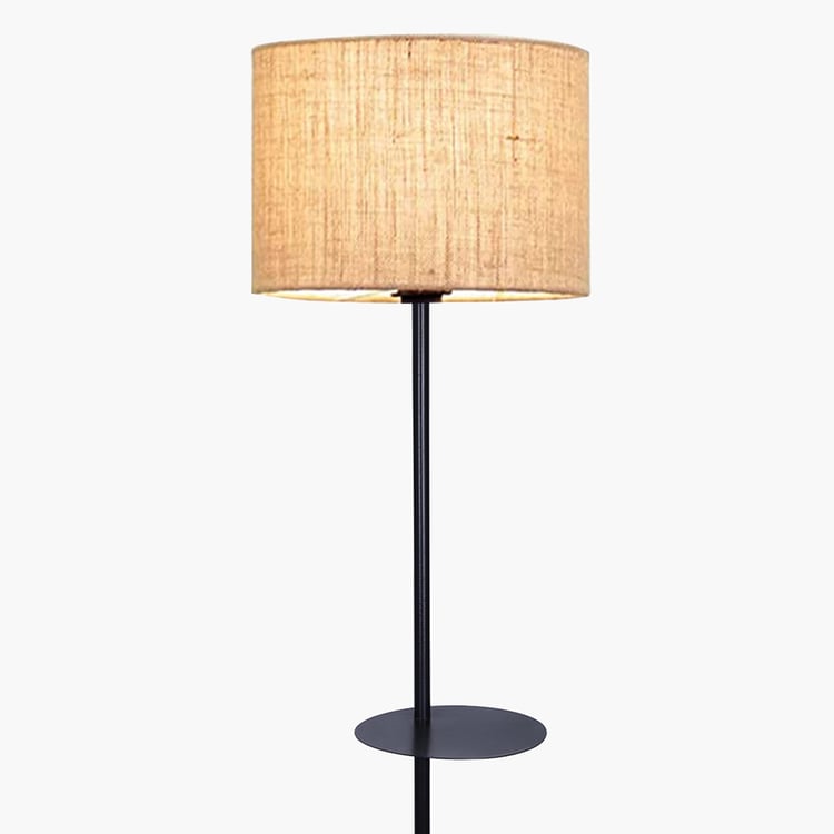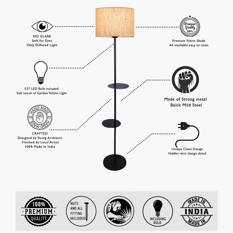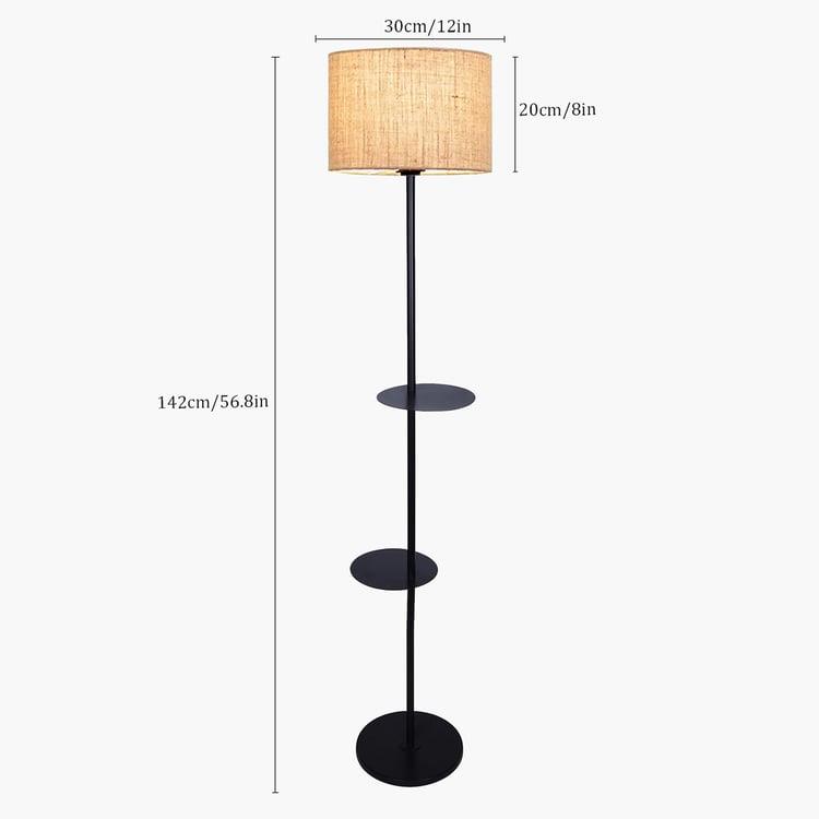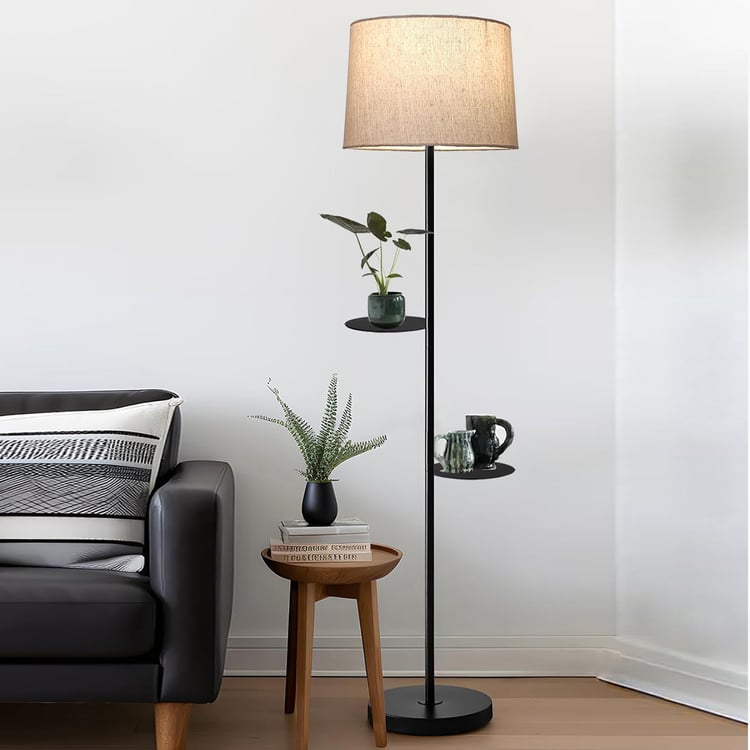 Sleek looks and minimalist detailing define this floor lamp with shelves, designed to blend lighting and functionality in one elegant piece. The fabric shade gently diffuses the light, creating a soft, comfortable glow. and is supported by a sturdy metal base. It features two open-frame shelves, ideal for displaying framed photos, decor accents, or plants.