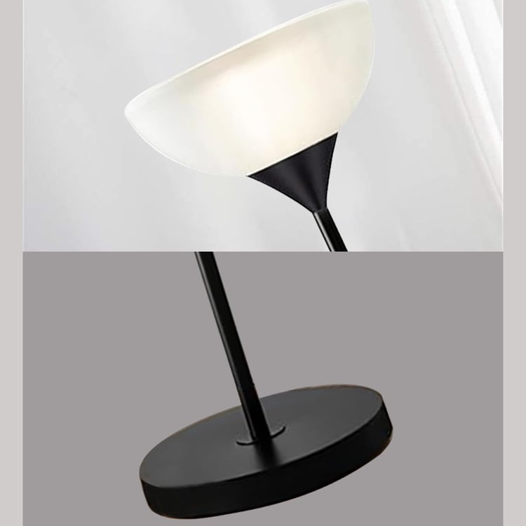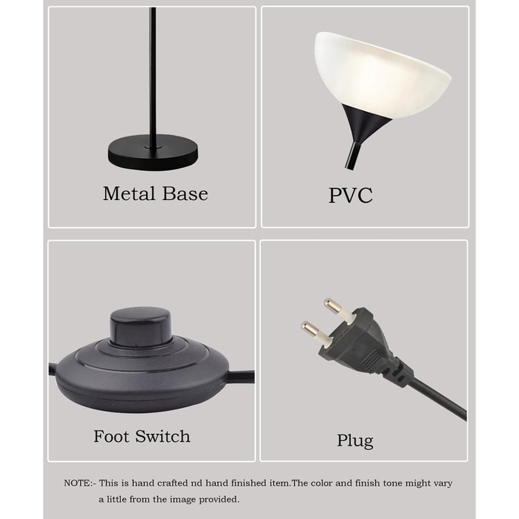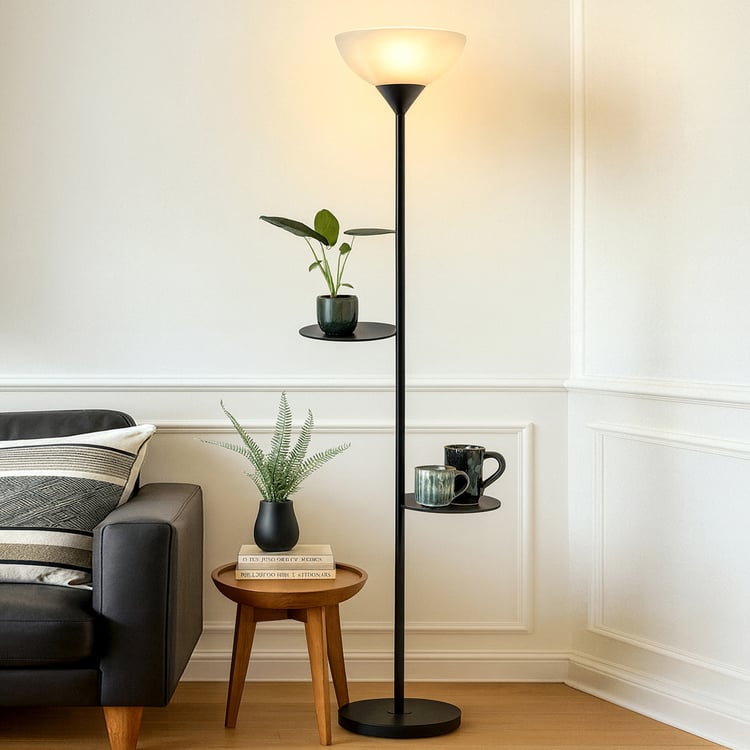 Designed to blend seamlessly into compact spaces, this floor lamp features a slim profile with a base that slides easily beneath sofas, recliners, and reading chairs. The sleek metal pole is topped with an uplighter shade that provides soft, ambient illumination. For everyday convenience, it includes a foot switch and a 2-pin plug. Thoughtfully designed with two integrated shelves on the pole, it offers space to display plants, books, or decor.