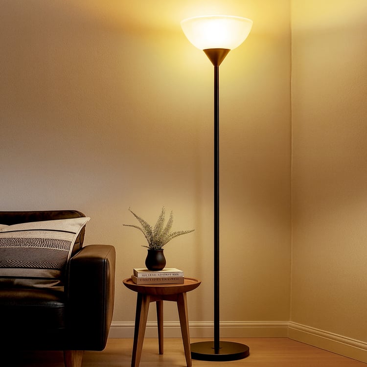 Designed to blend seamlessly into compact spaces, this floor lamp has a slim profile and base that slides easily beneath sofas, recliners, and reading chairs. This metal uplight pole is topped with an upright shade. It has a foot switch for convenience and a 2-pin plug.