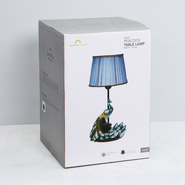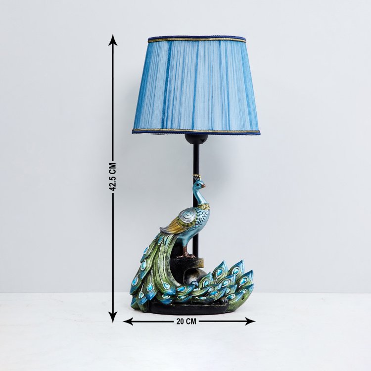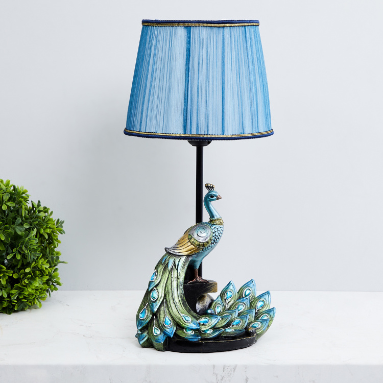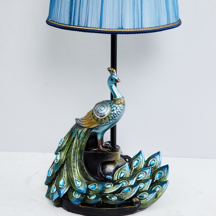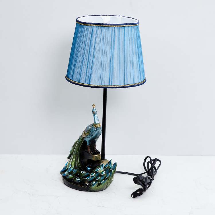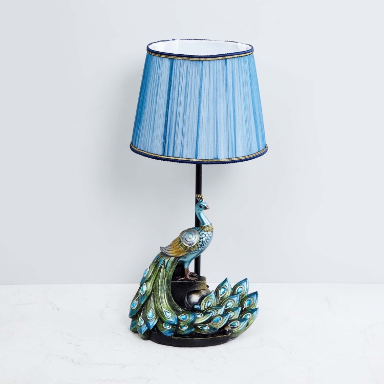 Light up your bedside with fine lighting. Classic and subtle, this table lamp features a peacock detailing coupled with a laminated fabric shade and a screw bulb holder.