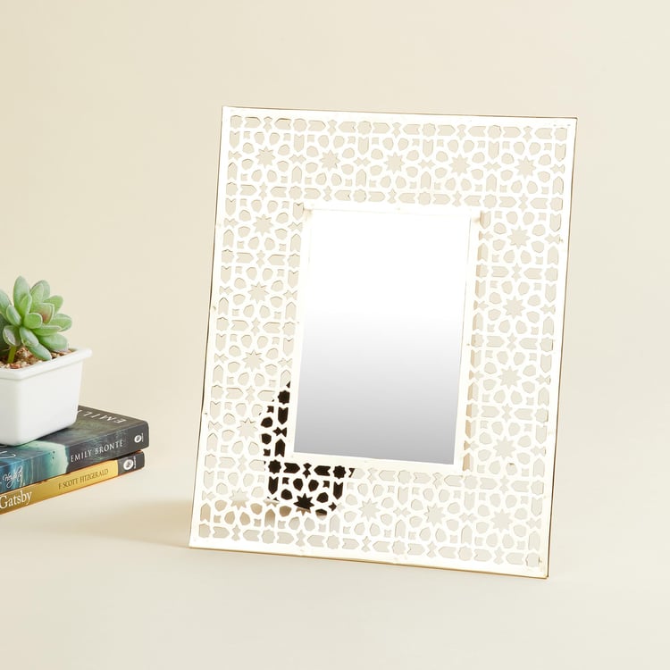 Give a finishing touch to your decor with this photo frame. It features a broad frame made of metal with cut-outs and a glass casing. It is designed to hold a single photo and comes with a convenient stand that allows you to place it on any smooth surface.